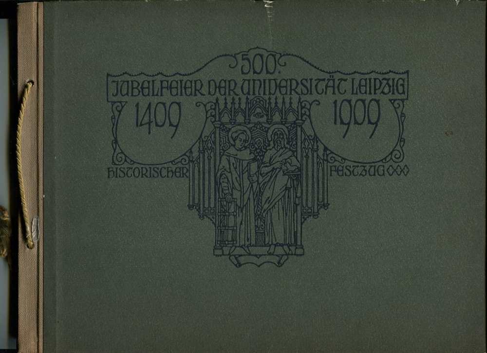 Der historische Festzug anläßlich der Jubelfeier des 500jährigen Bestehens der Universität Leipzig. In 25 kolorierten Vollbildern nach Originalen von Erich Grunder Leipzig, mit kurzem einleitenden Text von Prof. Carl Chun. 1909, Verlag von J.J. Weber, Leipzig, Leinen Querformat, 25 farbige Vollbilder/Tafeln, Schmutztitel mit Besitzerstempel und Name, Zustand: I