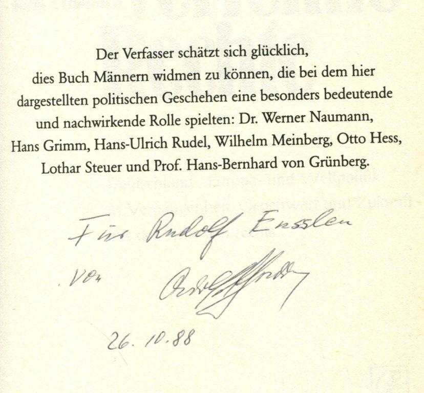 Unter von Thadden verfolgte die NPD einen betont rechtskonservativen und antikommunistischen Kurs. Mit dem Scheitern der überparteilichen Aktion Widerstand 1970, die sich gegen die Ostpolitik von Willy Brandt wandte, drängten die Radikalen innerhalb der NPD auf gewalttätige Aktionen im Stile der linken APO. Im Umfeld der NPD tauchten erste bewaffnete Gruppen auf. Auf dem Holzmindener Parteitag 1971 trat Adolf von Thadden deshalb zurück, unterstützte aber die Wahl seines Nachfolgers Martin Mußgnug. In seiner Rücktrittsrede klagte Thadden über Flügelkämpfe, Niedertracht und Handgreiflichkeiten innerhalb der Partei. Er schilderte die Resignation der vernünftigen Mitglieder" und kritisierte die Aktivisten, die Gewalt als Instrument der Politik akzeptierten. Die NPD sei in einem Zustand der faktischen Nicht-Mehr-Führbarkeit". Für einen Tanz auf einem Vulkan irrationaler Unvernunft" sei er weder geeignet noch bereit". 1975 verließ von Thadden die NPD endgültig aus Verärgerung über die Wahl von Gerhard Frey in den Bundesvorstand der NPD. Thaddens Ausstieg aus der NPD wurde als endgültiges Scheitern des legalistischen Kurses der Parteispitze bewertet. In einem Interview mit der Wochenzeitung Junge Freiheit bekräftigte Thadden 1994: Die heutige NPD hat nichts mehr zu tun mit der NPD der sechziger Jahre, also der Zeit, als ich Parteivorsitzender war." 1984, Verlag K.W. Schütz, Preussisch Oldendorf, Ganzleinen mit Goldprägung und Widmung vom Autor an/aus dem Nachlass von Rudolf Ensslen, Festeinband gebunden mit SU, 304 Seiten mit zahlr. s/w Abb., Zustand: I