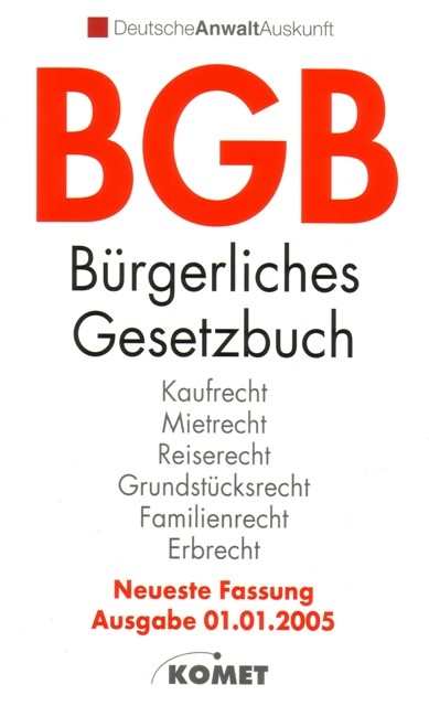 Das BGB ist als systematische zentrale Regelung des deutschen Privatrechts in fünf Bücher aufgeteilt. Das erste Buch mit dem Allgemeinen Teil enthält hierbei generelle Vorschriften für die nachfolgenden Bücher. Das zweite Buch Recht der Schuldverhältnisse regelt Vertragsverhältnisse wie Kaufverträge, Mietverträge oder Dienstverträge (Arbeitsrecht). Das dritte Buch Sachenrecht beschäftigt sich mit Eigentum und Besitz. Die Rechtsverhältnisse in Ehe, Lebenspartnerschaft, Familie und Verwandtschaft sowie deren Ersatzfunktionen wie Betreuung, Vormundschaft und Pflegschaft werden im vierten Buch Familienrecht geregelt. Im fünften und letzen Buch des BGB Erbrecht finden sich die Rechtsnormen zu Erbfolge, Testament oder Erbschein. Komet Verlag, Bonn, 2005, Broschur, 512 Seiten, Zustand: I