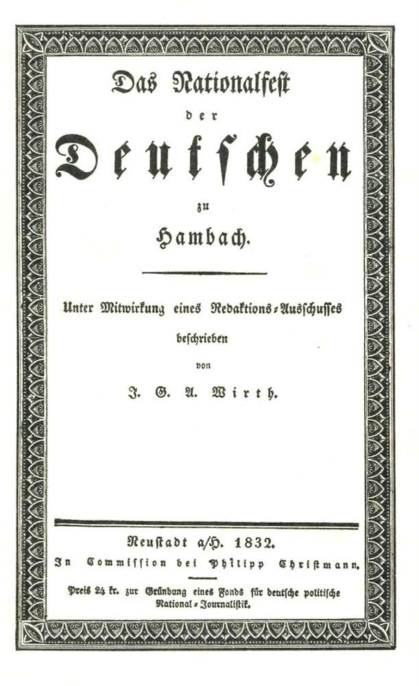Das Hambacher Fest fand vom 27. bis zum 30. Mai 1832 auf dem Hambacher Schloss statt. Das Schloss liegt in der Nähe von Hambach, heute Stadtteil von Neustadt an der Weinstraße. Hambach lag in der damals zum Königreich Bayern gehörigen Rheinpfalz. Das Fest galt als Höhepunkt bürgerlicher Opposition in der Zeit der Restauration und zu Beginn des Vormärz. Die Forderungen der Festteilnehmer nach nationaler Einheit, Freiheit und Volkssouveränität hatten ihre Wurzeln im Widerstand gegen die restaurativen Bemühungen des Deutschen Bundes. Nachdruck der Original-Ausgabe von 1832, 1981, Verlag Meininger, Neustadt an der Weinstraße, Broschur, 110 Seiten, Unter Mitwirkung eines Redaktions-Ausschusses beschrieben von J. G. A. Wirth, Neustadt a/H. 1832, In Commission bei Philipp Christmann Zustand: I