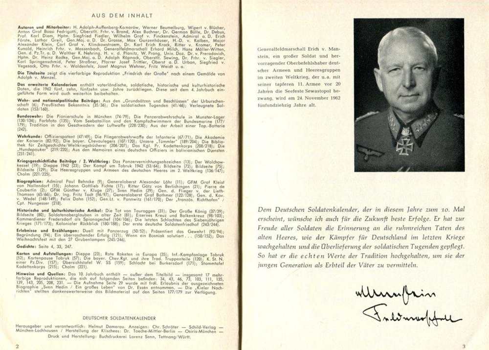 Inhalt: Generalfeldmarschall von Manstein, Admiral Behncke, Generaloberst Löhr, Generalfeldmarschall von Nollendorf, Generalfeldmarschall von Kluge, Wehrkunde, Wehrpolitik, Bundeswehr, Kriegsgeschichtliche Beiträge, Biographien, Erlebnisberichte, Tradition und Kultur, Erzählungen, Gemälde und Bildberichte, Gedichte, Sprüche, Kalendarium 1962 und vieles mehr. Reichlich illustriert, mit Berichten aus allen Epochen deutscher Wehrgeschichte, ohne Bruch der Traditionslinie. 1962, Schild Verlag, München, Broschur, 272 Seiten mit s/w Fotos, Abb., Bilder und Farbtafel, Einband bestoßen, leichte Gebrauchsspuren, Zustand: I-II