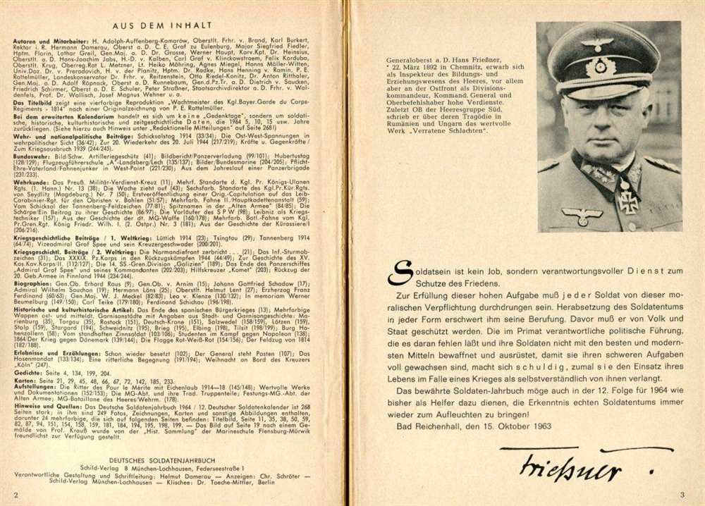 Inhalt: Generaloberst Frießner, Siegfried Goes, Generaloberst Raus, Generaloberst von Arnim, Admiral Souchon, Hermann Löns, Oberstleutnant Lent, Wehrkunde, Wehrpolitik, Bundeswehr, Kriegsgeschichtliche Beiträge, Biographien, Erlebnisberichte, Tradition und Kultur, Erzählungen, Gemälde und Bildberichte, Gedichte, Sprüche, Kalendarium 1964 und vieles mehr. Reichlich illustriert, mit Berichten aus allen Epochen deutscher Wehrgeschichte, ohne Bruch der Traditionslinie. 1964, Schild Verlag, München, Broschur, 268 Seiten mit s/w Fotos, Abb., Bilder und Farbtafel, Einband bestoßen, Zustand: II-III