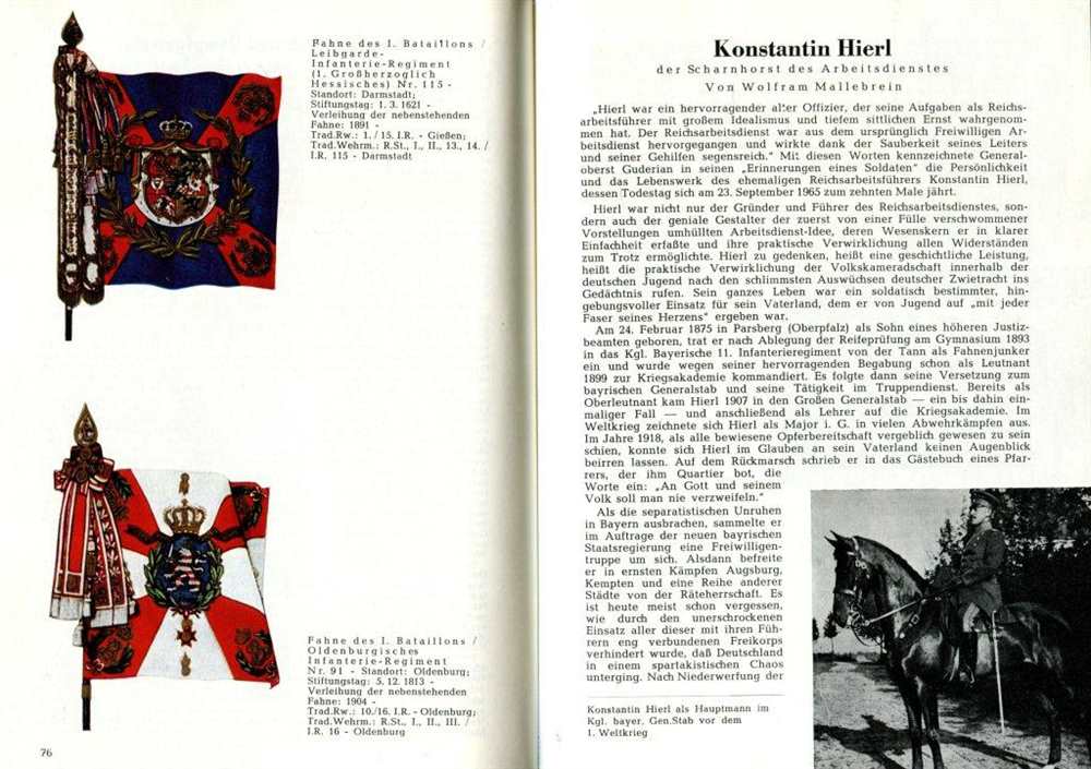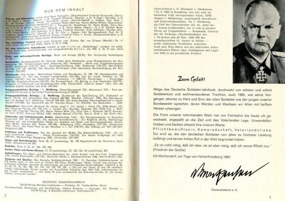 Inhalt: Generaloberst von Mackensen, Ernst Moritz Arndt, General Reinhard, Generalfeldmarschall Model, Feldmarschall von Laudon, Generalmajor Maercker, GFM Frhr. von Richthofen, Fregattenkapitän Hersing, Major Wick, Wehrkunde, Wehrpolitik, Bundeswehr, Kriegsgeschichtliche Beiträge, Biographien, Erlebnisberichte, Tradition und Kultur, Erzählungen, Gemälde und Bildberichte, Gedichte, Sprüche, Kalendarium 1965 und vieles mehr. Reichlich illustriert, mit Berichten aus allen Epochen deutscher Wehrgeschichte, ohne Bruch der Traditionslinie. 1965, Schild Verlag, München, Broschur, 270 Seiten mit s/w Fotos, Abb., Bilder und Farbtafel, Einband bestoßen, Zustand: II-III