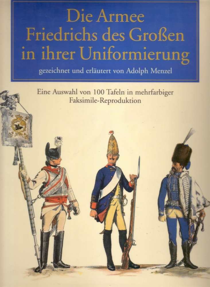 Ein Abriss aller wichtigen Regimenter, ihrer Kommandeure und Schlachteneinsätze in den beiden Schlesischen Kriegen und im Siebenjährigen Krieg. Eines der wenigen Bücher oder eher Nachdrucken der Uniformen aus der Zeit Friedrichs des Großen. Eine Auswahl von 100 Tafeln in mehrfarbiger Faksimile-Reproduktion, man merkt es an der veralteten Sprache und daran das es wohl zu einem Zeitpunkt geschrieben wurde als die preußsiche Armee gerade ihre große Niederlage gegen Napoleon hinnehmen musste. Zu jedem Regiment gibt es einen Text mit der Feldzugsgeschichte, der Garnison, den Regimentschefs bis ca. 1800 und anderen Details, die Uniform betreffend. Wer sich gerne schöne und ausgezeichnete Bilder der Uniformen ansieht wird begeistert sein. 1998, Battenberg Verlag, Augsburg (Weltbild), Ganzleinen Großformat mit Goldprägung und SU, 232 Seiten, zahlreiche farbige und s/w Bilder und Abb., Besitzerstempel, Zustand: I