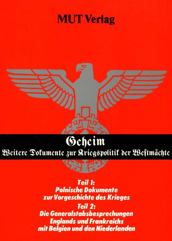 Teil 1: Polnische Dokumente zur Vorgeschichte des Krieges - Teil 2: Die Generalstabsbesprechungen Englands und Frankreichs mit Belgien und den Niederlanden. Der "Polenfeldzug" gründete sich für das Deutsche Reich auf die von Hitler bezeichnete deutsch-sowjetische "Vernunftehe", mit der er sich gegen Frankreich und Großbritannien den Rücken freizuhalten gedachte. Die Aufteilung der deutsch-sowjetischen Interessensphäre sollte nach Hitlers Willen jedoch nicht von langer Dauer sein, wie er bereits Mitte August 1939 intern verkündete: Nach der Niederschlagung der Westmächte sollte die Eroberung von "Lebensraum im Osten" und die Ausbeutung der eroberten Gebiete als vorrangiges Kriegsziel in Angriff genommen werden. 1977, MUT Verlag, Asendorf, Atlas-Großformat, Broschur, 238 Seiten mit Übersichtskarte, Einband innen mit Name, Zustand: I-II