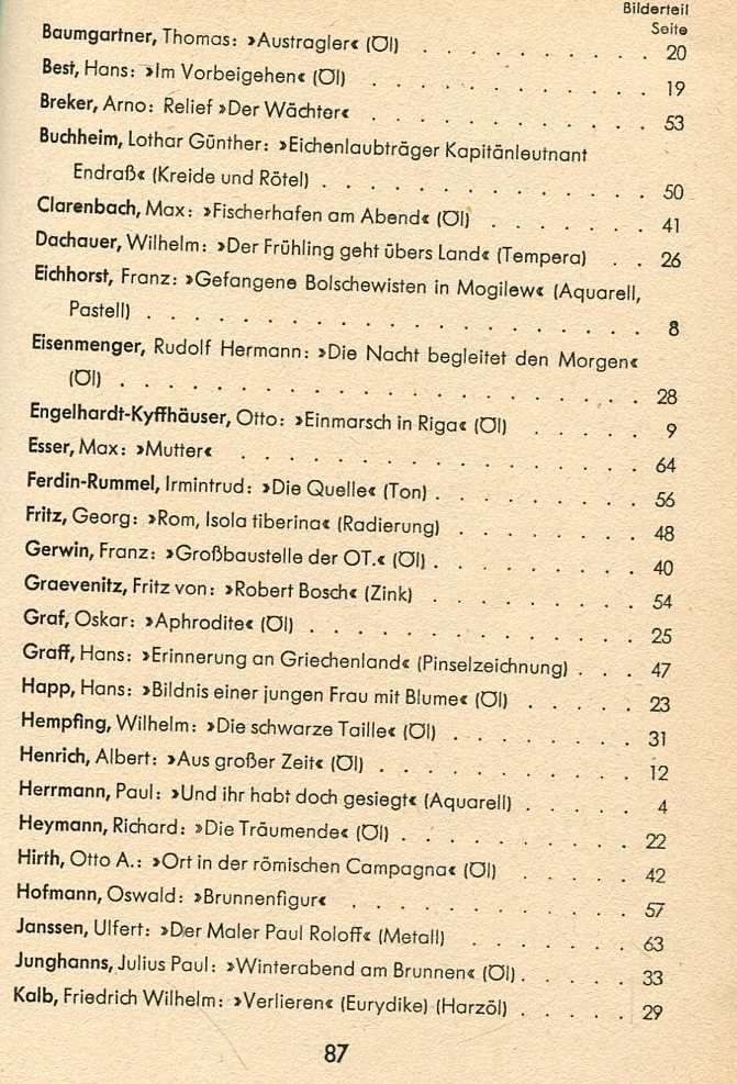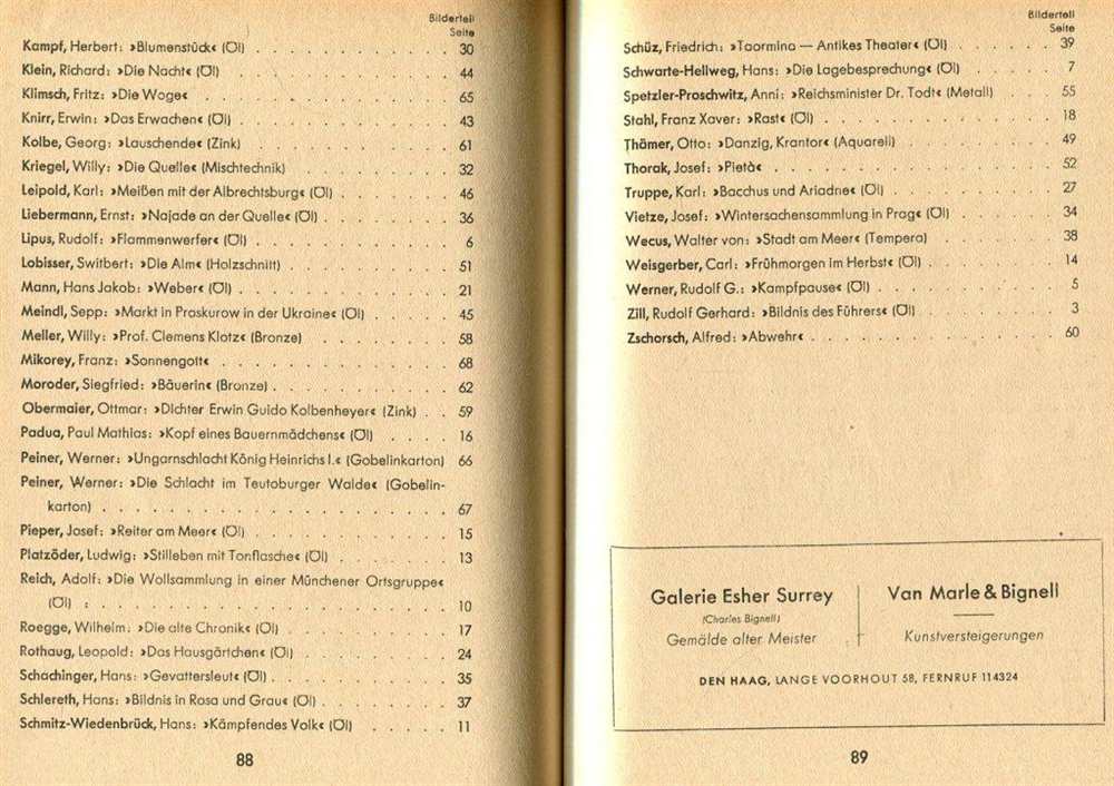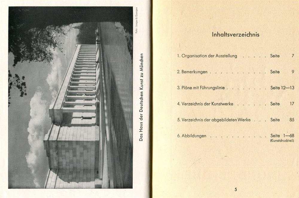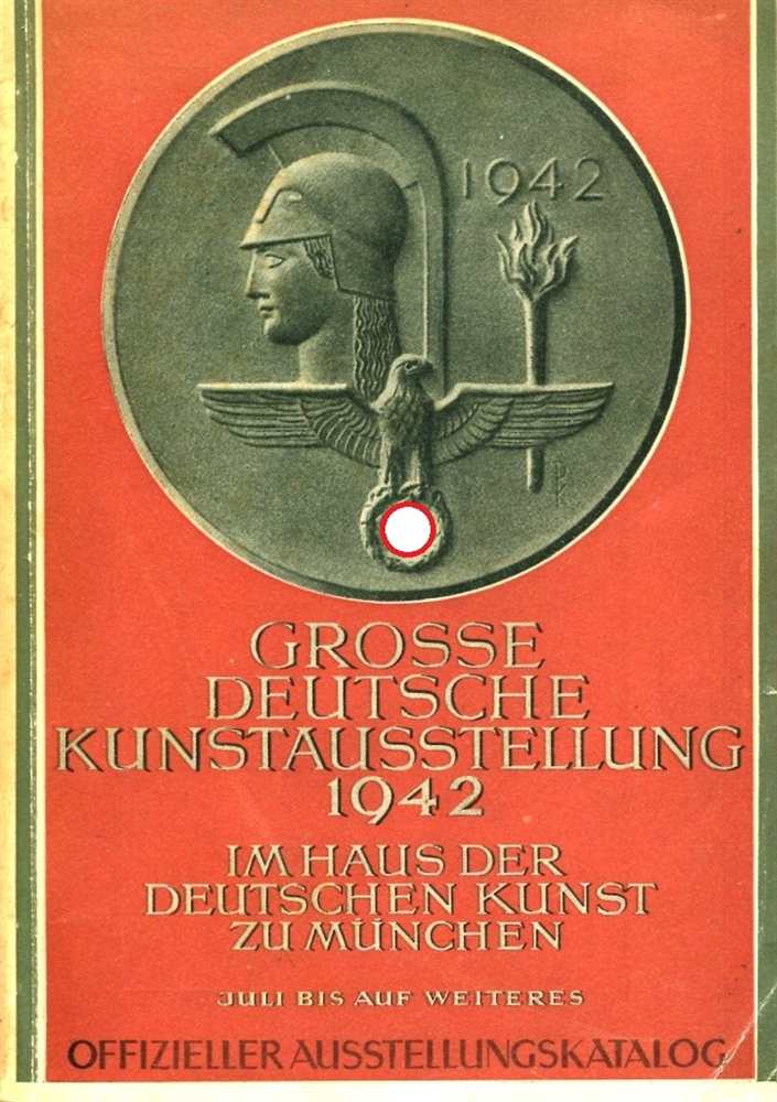 Die Große Deutsche Kunstausstellung, die sich über das Erdgeschoss, das Obergeschoss und die zweigeschossige Ehrenhalle in der Mitte des Gebäudes erstreckte, war eine wichtige kulturelle Veranstaltung. Die Schau war als Verkaufsausstellung konzipiert, Künstler konnten mit mehreren Werken (in der Regel bis zehn Werke) vertreten sein, wobei mitunter auch nicht verkäufliche Werke, z. B. Leihgaben, ausgestellt wurden. Während der Ausstellung wurde jeweils in einer Sonderschau einem ausgewählten Künstler die Gelegenheit gegeben, sich umfassender zu präsentieren. 3. Ausgabe (Auflage 50.000) 1942, Verlag F. Bruckmann, München, Katalog/Broschur, 199 Seiten, zahlr. s/w Abb. mit Verzeichnis der abgebildeten Werke, Werbeanhang aus der Zeit, Einband mit Knick, Buchrücken fleckig, Innenseiten sehr gut, Zustand: I-II