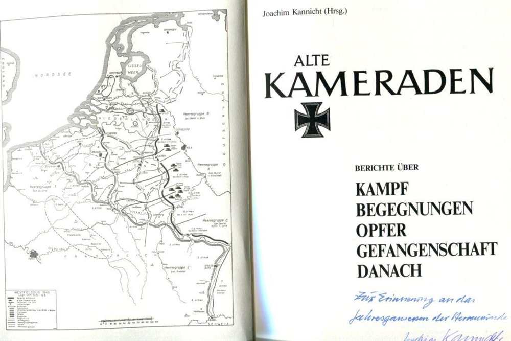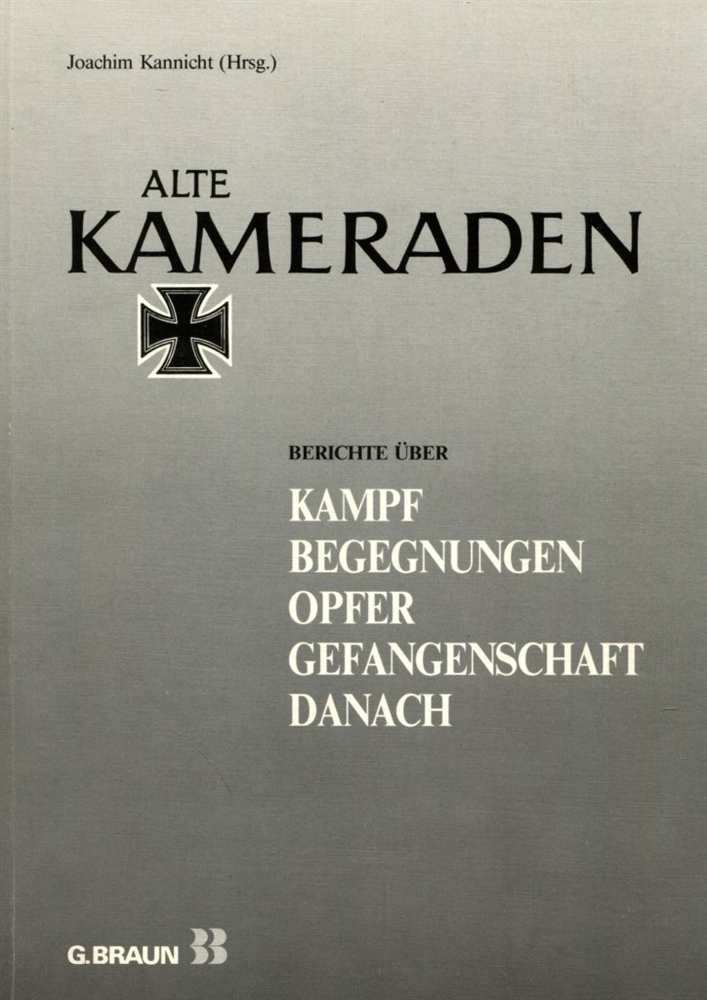 Im Jahre 1992 war die Soldatenzeitschrift "Alte Kameraden" 40 Jahre lang erschienen. Aus diesem Anlass stellte Joachim Kannicht in einem Buch die besten Beiträge über Krieg, Begegnungen, Opfer der Gefallenen und Verwundeten, die Gefangenschaft und die Nachkriegszeit zusammen. Die Beiträge bilden einen wahrheitsgemäßen und umfassenden Einblick in das Erlebnis der Kriegsgeneration, die getreu ihrem Fahneneid im Krieg ihre Pflicht getan und Schweres erlebt hat, aber nach Kriegsende und Gefangenschaft den Wiederaufbau Deutschlands und den Aufbau der Bundeswehr wesentlich mitgestaltet hat. Die Neuauflage des Buches dient nicht nur den alten Soldaten zur Auffrischung ihrer Erinnerung, sondern sie ist besonders für junge Leser eine wichtige Quelle für ein unverfälschtes Geschichtsbild. 1991, Verlag G. Braun, Karlsruhe, Broschur, 368 Seiten mit s/w Fotos, Abb. und Auflistung der Großverbände (auch die Wappen), Titelblatt mit Widmung und Signatur vom Autor 1992, Zustand: I-II