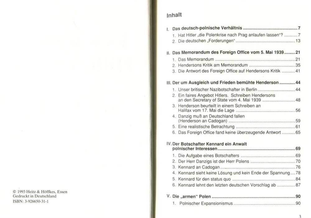 Die bisherigen Darstellungen zur Frage der Kriegsschuld sind zu einem großen Teil mit der Danzigfrage beschäftigt. Das war insofern berechtigt, als sich an ihr der Kriegsausbruch entzündet hatte. Würden wir aber Danzig als den entscheidenden Anlaß nehmen, würden wir zu kurz treten. Über Danzig allein hätte sich vielleicht ein englisch-deutscher Kompromiß, vor allem wegen Hitlers Bereitschaft dazu, erzielen lassen. Er hätte die polnische Unabhängigkeit und britische Interessen nicht berühren dürfen. Ohne die britische Rückendeckung hätte auch Polen zustimmen müssen. 1993, Heitz & Höffkes Verlag, Essen, Broschur, 195 Seiten, Widmung und Signatur vom Autor Zustand: I