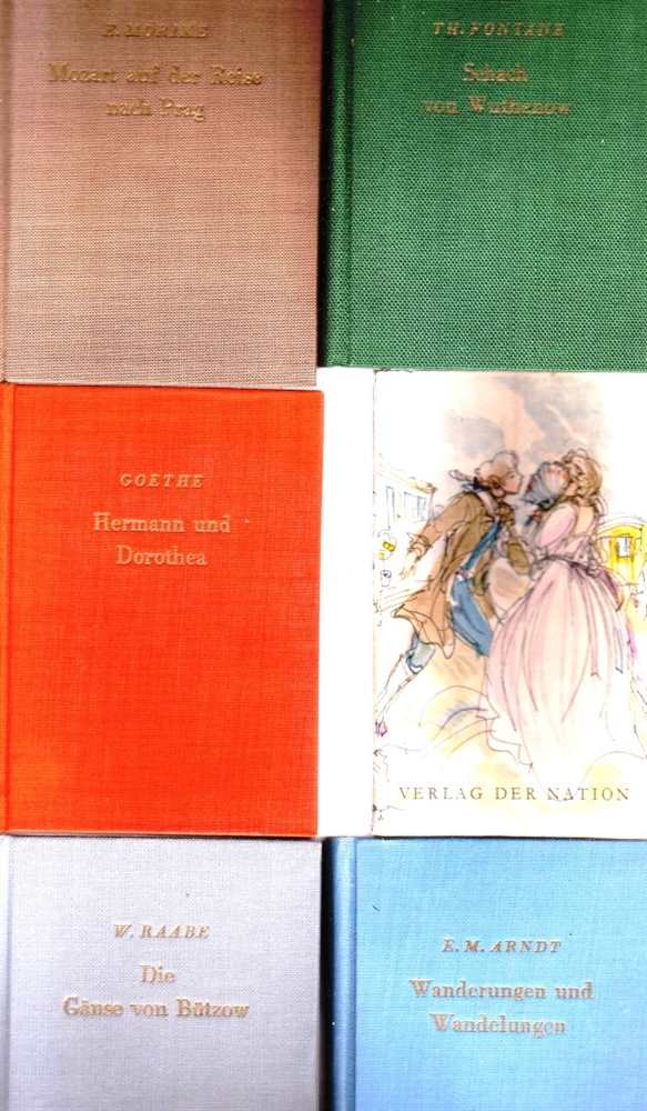 Konvolut im farbigen Pappschuber: KLEINE BIBLIOTHEK, 1. Arndt, Wanderungen und Wandelungen mit dem Reichsfreiherrn von Stein; 2. Mörike, Mozart auf der Reise nach Prag; 3. Goethe, Hermann und Dorothea; 4. Raabe, Die Gänse von Bützow; 5. Fontane, Schach von Wuthenow (Kleine Bibliothek: Hermann und Dorothea; Mozart auf der Reise nach Prag; Meine Wanderungen und Wandelungen mit dem Reichsfreiherrn vom Stein; Die Gänse von Bützow; Schach von Wuthenow) 1955, Verlag der Nation, Leinen, in bebildertem Pappschuber, jeweils ca. 250 Seiten, 12 cm, insgesamt 590 g., gebundene Ausgabe, Ganzleinen mit Goldprägedruck, Zustand: I