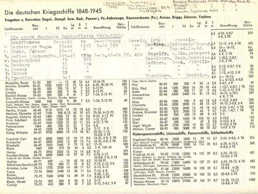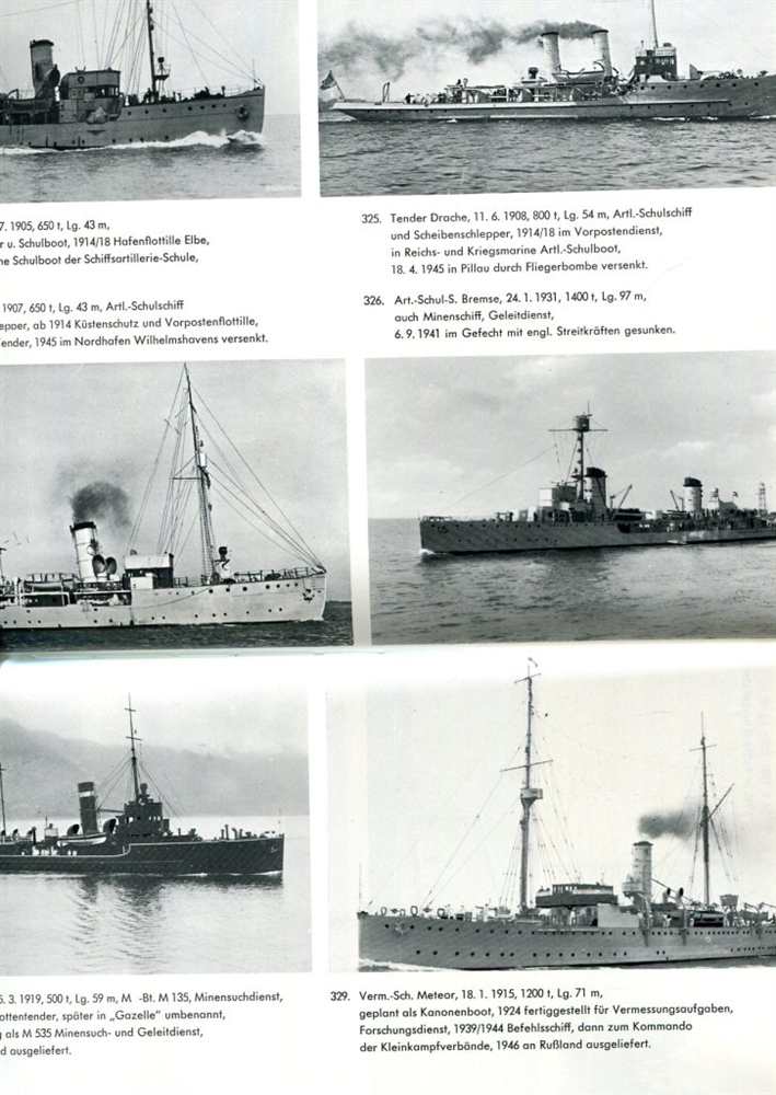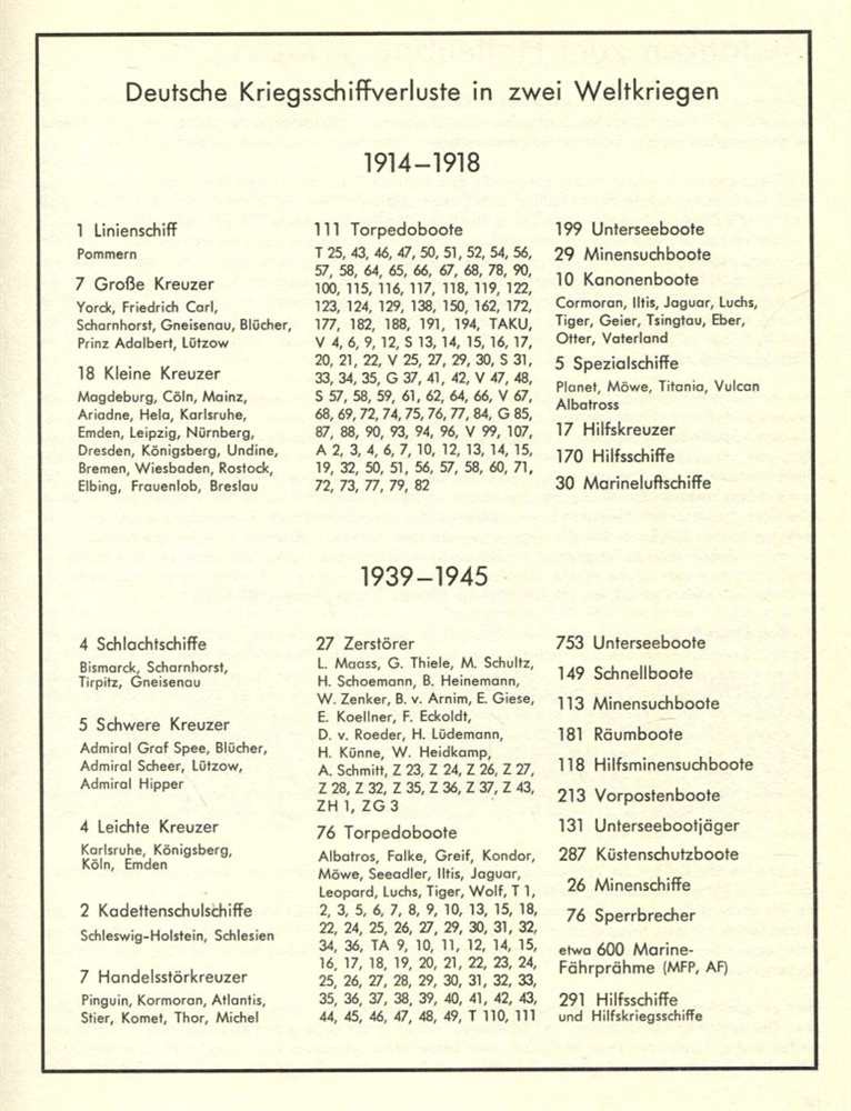 Geschichte des Deutschen Kriegsschiffbaus in 437 Bildern. Im vorliegenden Band sind alle wesentlichen Schiffstypen abgebildet, die in den deutschen Marinen gefahren sind und an der geschilderten Entwicklung teilgenommen haben. Es ist erhebend und schmerzlich zugleich, sich beim Betrachten der Bilder klarzumachen, welche Leistungen der Wissenschaft und Technik erforderlich waren, um diese Schiffe zu bauen, und wie viel Ausbildungsarbeit in sie hineingesteckt worden waren. Vor allem sei die Unmenge von Schicksalen nicht vergessen, die mit diesen Schiffen eng verbunden waren. 1898 verkündete Kaiser Wilhelm II. anlässlich der Eröffnung des Stettiner Hafens die künftige Zielsetzung des noch jungen deutschen Nationalstaates: Die Zukunft der Deutschen lag auf dem Wasser! Tabellarisch und stichwortartig aufgelistete Schiffsschicksale der an den beiden Weltkriegen beteiligten aktiven Kriegsschiffe aller Nationen. 5. Auflage 1973, Verlag Lohse-Eissing, Wilhelmshaven, Ganzleinen ohne SU, Atlas Großformat, Festeinband gebunden, keine Seitenanzahl mit zahlr. s/w. Fotos und Abb., Zustand: I-II