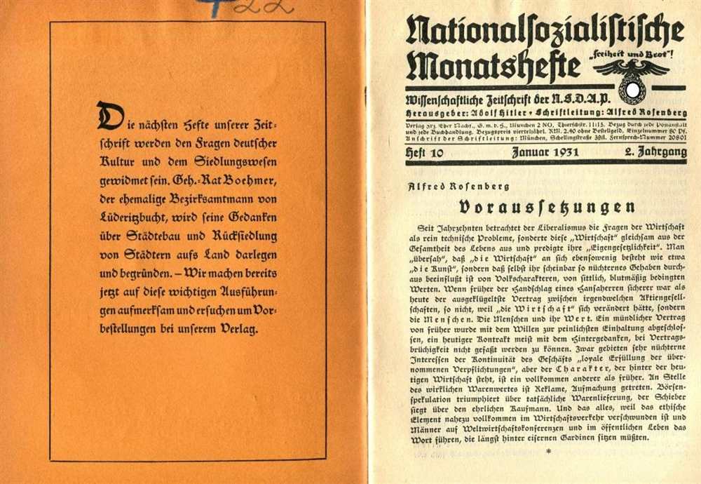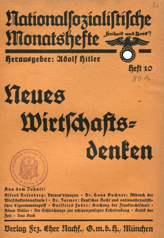 Aus dem Inhalt: Neues Wirtschaftsdenken; Rosenberg: Voraussetzungen; Buchner: Abbruch der Wirtschaftsdemokratie; Jarmer: Deutsches Recht und nationalsozialistischer Eigentumsbegriff; Feder: Brechung der Zinsknechtschaft; Adam Müller; Die Schleichwege zur achtprozentigen Lohnsenkung; Kritik der Zeit; Bücherschau. Herausgeber: Adolf Hitler. 1931, Verlag Frz. Eher Nachf., GmbH, München, Broschur, 48 Seiten, Einband leicht bestoßen und mit Bleistift Eintragung, Stempel: Institut für politische Pädagogik an der Universität Berlin, Zustand: III-IV
