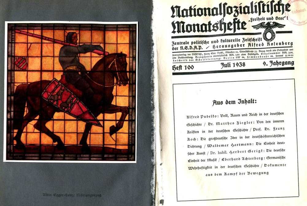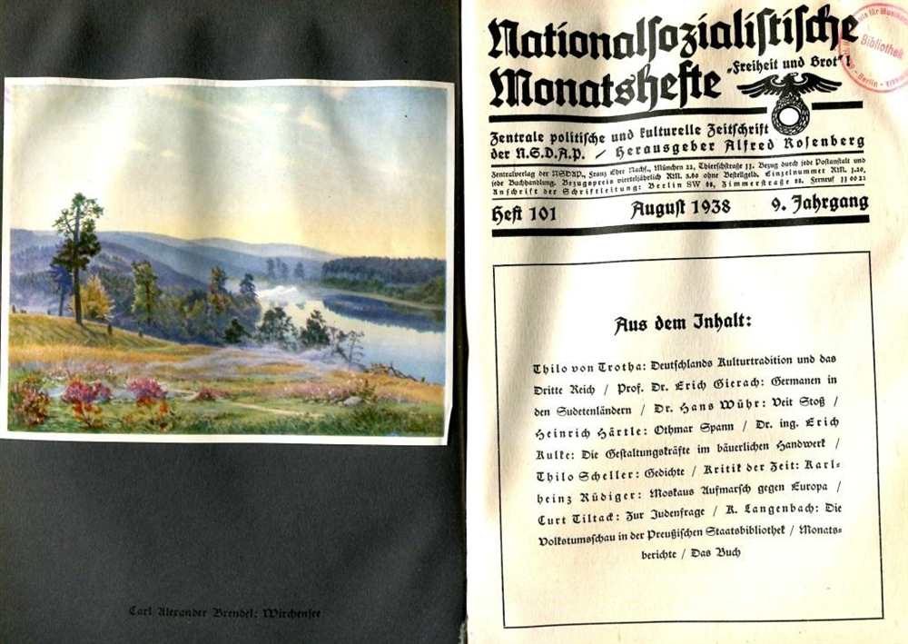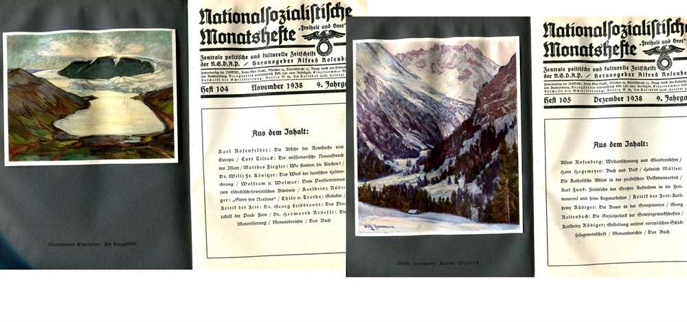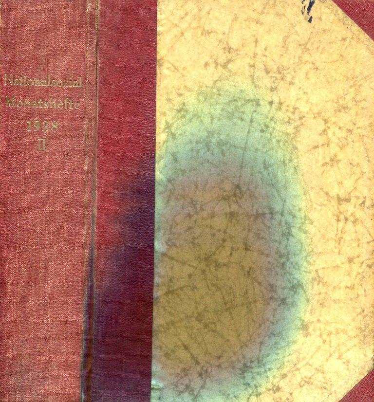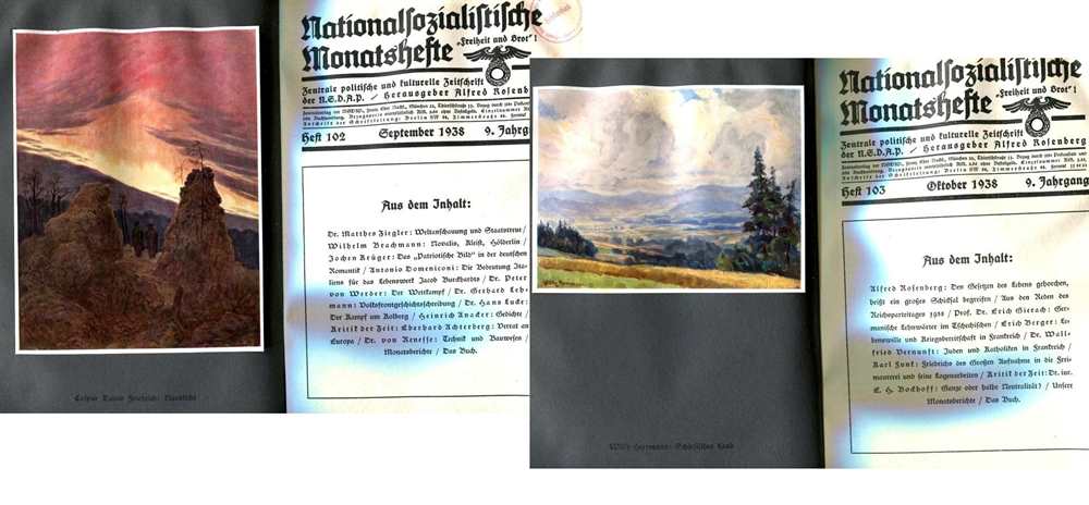 Heft 104: Karl Rosenfelder, Die Abkehr der Romkirche von Europa / Anpassung, die große Missionsparole der Gegenwart / Aufbau eines farbigen katholischen Klerus / Auf dem Weg zum Asiatismus der Romkirche / Der Kampf um Indien / Die missionsstrategische Lage der Philippinen / "Wer sein Blut, seine Rasse mehr liebt als mich, der ist meiner nicht wert") - Curt Tiltack: Der missionarische Neuaufbruch des Islam (Die christlichen Missionsversuche / Islamische Gegenmission / Die Gründe für das erfolgreiche Vordringen des Islam) - Matthes Ziegler: Wo standen die Kirchen? Ein notwendiges Nachwort zu den September-Tagen 1938, u.v.m. Heft 105: montierte Farbtafel (Willy Hermann: Kleines Walsertal) - Alfred Rosenberg: Weltanschauung und Glaubenslehre. Vortrag zur Eröffnung des Wintersemesters der Martin-Luther-Universität Halle-Wittenberg, am 4. November 1938 - Hans Hagemeyer: Buch und Volk, Rede auf der Abschlusskundgebung der ersten Großdeutschen Buchwoche in München am 6. November 1938 - Heinrich Müller: Die Katholische Aktion in der praktischen Volktumsarbeit / Die katholische Volkstumsaktion in Unterricht, Schule und Jugenderziehung / Die katholische Volkstumsaktion in der Gestaltung des Familienlebens / Die katholische Volkstums Aktion in der Gestaltung des öffentlichen Volkslebens / Die katholische Besetzung unserer nationalen Feiern / Die katholische Besetzung unseres völkischen Brauchtums / Die katholische Besetzung der deutschen Volksspielpflege / Die kirchliche Sakralisierung des öffentlichen Lebensraumes unseres Volkes / Das Volkstum, u.v.m. 1938, Zentrale politische und kulturelle Zeitschrift der N.S.D.A.P., Verlag Frz. Eher Nachf., GmbH, München, Halbleinen im Festband mit Goldprägung, 560 Seiten mit farbigen und s/w Abb., Seiten altersbedingt gebräunt aber gut lesbar, Einband bestoßen und löst sich vom Rücken, Wasserschaden und fleckig, roter Stempel mit: Staatl. Hochschule für Musikerziehung u. Kirchenmusik Berlin - Charlottenburg auf zahlr. Seiten, Zustand: IV-V