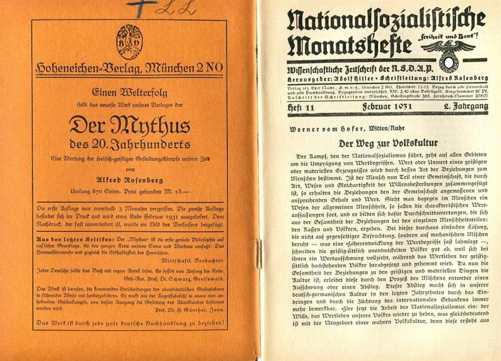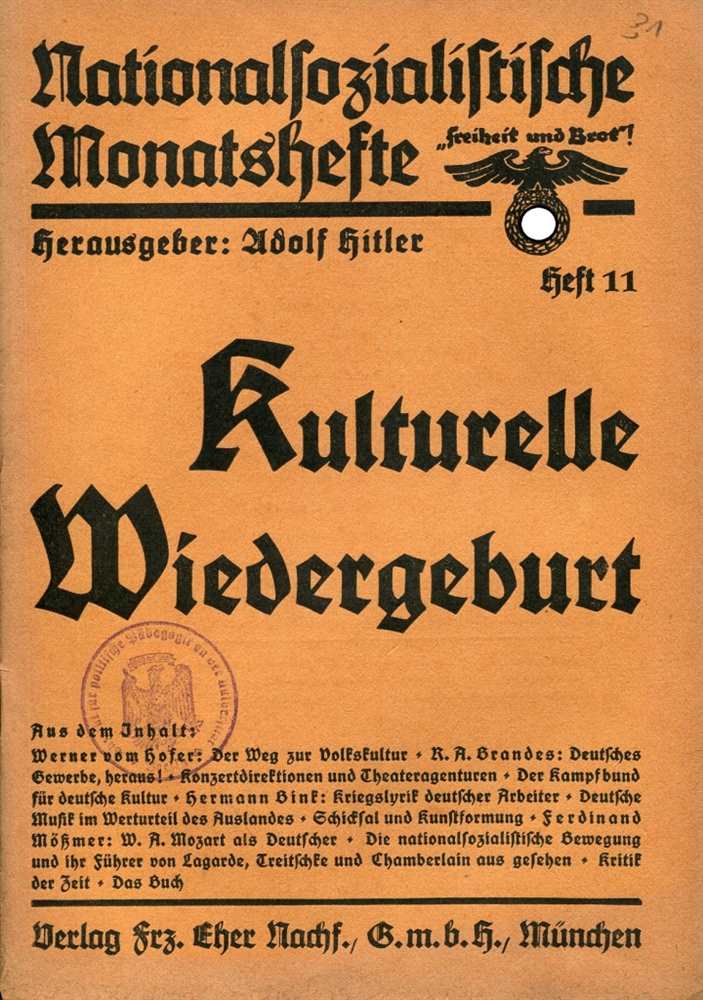 Aus dem Inhalt: Kulturelle Wiedergeburt; Rosenberg: Werner vom Hofer, Witten/Ruhr: Der Weg zur Volkskultur - R. A. Brandes, Regierungsbaumeister a.D., Köln: Deutsches Gewerbe, heraus! Kampf gegen die amerikanischen Industrialisierungsmethoden - Konzertdirektionen und Theateragenturen, seit jeher eine Domäne jüdischen Geschäftssinnes - Der Kampfbund für deutsche Kultur - Hermann Bink: Kriegslyrik deutscher Arbeiter - Deutsche Musik im Werturteil des Auslandes - Schicksal und Kunstformung, von Alfred Rosenberg - Ferdinand Mößmer, Vorstand der Mozartgemeinde München: W. A. Mozart als Deutscher. Zum 175. Geburtstag - Die nationalsozialistische Bewegung und ihr Führer von Lagarde, Treitschke und Chamberlain aus gesehen; Kritik der Zeit; Bücherschau. Herausgeber: Adolf Hitler. 1931, Verlag Frz. Eher Nachf., GmbH, München, Broschur, 48 Seiten, Einband leicht bestoßen und mit Bleistift Eintragung, Einband löst sich vom Block, Stempel: Institut für politische Pädagogik an der Universität Berlin, Zustand: III-IV