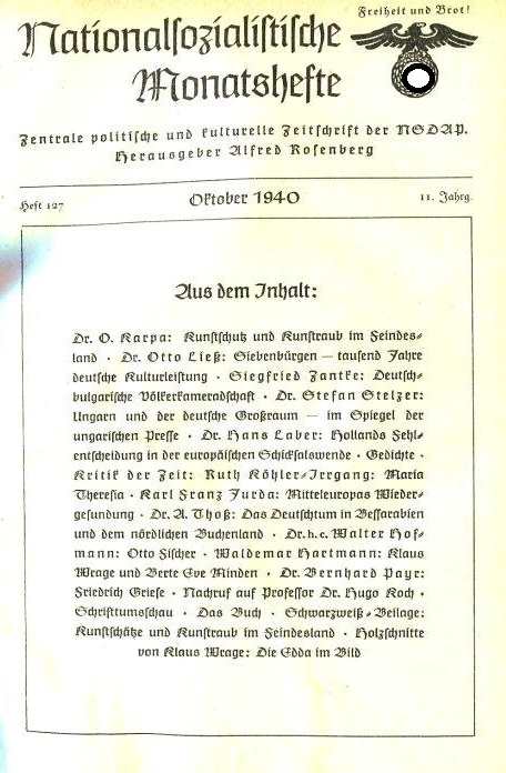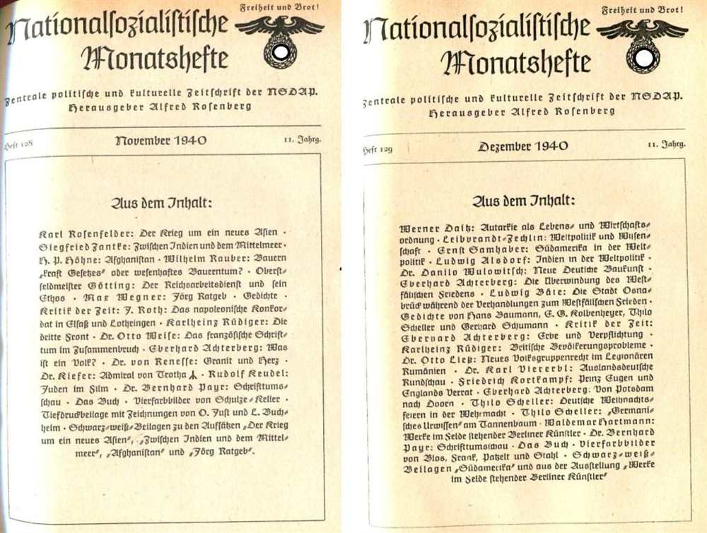 Aus dem Inhalt: Heft 127: Dr. O. Karpa: Kunstschutz und Kunstraub im Feindesland / Dr. Otto Ließ: Siebenbürgen - tausend Jahre deutsche Kulturleistung / Siegfried Zantke: Deutsch-bulgarische Völkerkameradschaft / Dr. Stefan Stelzer: Ungarn und der deutsche Großraum - im Spiegel der ungarischen Presse / Dr. Hans Laber: Hollands Fehlentscheidung in der europäischen Schicksalswende / Gedichte / Kritik der Zeit: Ruth Köhler-Irrgang: Maria Theresia. Zu ihrem Regierungsantritt am 20. Oktober 140 / Karlheinz Jurda: Mitteleuropas Wiedergesundung. Wandlung des Ostens / Dr. A. Thoß: Das Deutschtum in Bessarabien und dem nördlichen Buchenland / Dr. h.c. Walter Hoffmann: Otto Fischer / Waldemar Hartmann: Klaus Wrage und Berte Eve Minden / Payr: Friedrich Griese / Nachruf auf Professor Dr. Hugo Koch / Schriftumschau; Kritik der Zeit; Das Buch. Heft 128: Karl Rosenfelder: Der Krieg um ein neues Asien / Siegfried Zantke: Zwischen Indien und dem Mittelmeer / H.P. Höhne: Afghanistan, Torhüter oder Torsprenger Indiens? / Wilhelm Rauber: Bauern "kraft Gesetzes" oder wesenhaftes Bauerntum? Gedanken über die Notwendigkeit eines Lebens gesetzlichen Landbaus (Krieg und Verstädterung, Die geistige Wandlung im modernen Frauen tun, Wege zu einem neuen bäuerlichen Bewusstsein) / Oberstfeldmeister Götting: Der Reichsarbeitsdienst und sein Ethos. Arbeitet als Dienst / Max Wegner: Jörg Ratgeb, der Maler einer deutschen Zeitenwende / Gedichte / Kritik der Zeit; das Buch. Heft 129: Werner Daitz: Autarkie als Lebens- und Wirtschaftordnung / Leibbrandt-Zechlin: Weltpolitik und Wissenschaft / Ernst Samhaber: Südamerika in der Weltpolitik / Ludwig Alsdorf: Indien in der Weltpolitik / Dr. Danilo Wulowitsch: Neue Deutsche Baukunst / Eberhard Achterberg: Die Überwindung des Westfälischen Friedens / Ludwig Bäte: Die Stadt Osnabrück während der Verhandlungen zum Westfälischen Frieden / Gedichte von Hans Baumann, Kolbenheyer, Scheller und Schumann / Kritik der Zeit: Achterberg: Erbe und Verpflichtung / Karlheinz Rüdiger: Britische Bevölkerungsprobleme / Ließ: Neues Volksgruppenrecht im Legionären Rumänien / Viererbl: Auslandsdeutsche Rundschau / Kortkampf: Prinz Eugen und England Verrat / Scheller: Deutsche Weihnachtsfeiern in der Wehrmacht / Scheller: Germanisches Urwissen am Tannenbaum / Hartmann: Werke im Felde stehender Berliner Künstler / Payr: Schriftumschau / Das Buch / Vierfarbbilder von Blos, Frank, Patzelt und Stahl. 1940, Zentrale politische und kulturelle Zeitschrift der N.S.D.A.P., Verlag Frz. Eher Nachf., GmbH, München, Halbleinen im Festband, 256 Seiten mit farbigen und s/w Abb., Seiten altersbedingt gebräunt aber gut lesbar, Einband bestoßen, leichter Wasserschaden, Zustand: IV-V