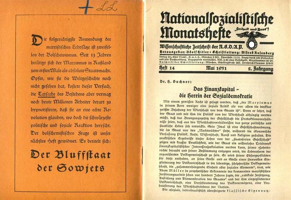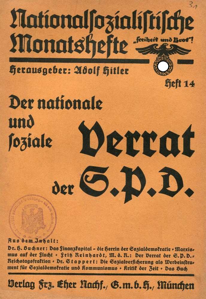 Aus dem Inhalt: Verrat der SPD; Dr.H. Buchner: Das Finanzkapital, die Herrin der Sozialdemokratie - Marxismus auf der Flucht - Fritz Reinhardt, M.d.R.: Der Verrat der SPD-Reichstagsfraktion. Wahlspruch und Wirklichkeit (Der Wahlaufruf der SPD zur Reichstagswahl 1930 / Verfassungsverräter, Notverordnungspolitiker / Verfassungsfeier 11. August 1930 / Die SPD nach der Wahl für Verfassungsbruch und Notverordnung / S.P.D.-Vertrauenskundgebung für die "Regierung des Angriffs gegen die Arbeiterschaft" / Die S.P.D. für Krankensteuer, Arzneisteuer, Bürgersteuer, Gemeindegetränkesteuer, Gemeindebiersteuer, Ledigensteuer usw. / Die S.P.D. gegen Winterbeihilfe an die Hungernden und Frierenden / Die S.P.D. gegen die Verbilligung von Frischfleisch zwecks Abgabe an die minderbemittelte Bevölkerung / Die S.P.D. gegen die Verbesserung der Kriegsopferversorgung / Die S.P.D. für die Herabsetzung der Beamtengehälter / Die S.P.D. für die Entlassung von Angestellten und Arbeiter / Die S.P.D. gegen die Streichung von besonderen Dienstaufwandsentschädigungen für Minister / Die S.P.D. gegen Kürzung der Reichstagsdiäten / Die S.P.D. gegen Verwendung eingesparte Reichstagsdiätensummen zugunsten der Bedürftigen unter den ausgesteuerten Erwerbslosen, aber für Verwendung der eingesparten Reichstagsdiätensummen für Neubeziehung der Sessel im Sitzungssaal des Reichsrats usw. / Revolte in der S.P.D. Angst vor Neuwahlen. Die vernichtende Entscheidungsschlacht durch die N.S.D.A.P. ("Wir haben durch unseren Auszug aus dem Reichstag die S.P.D. gezwungen, an ihrer V e r l o g e n h e i t und an ihrem V e r r a t zugrundezugehen. Daß wir auf dem richtigen Weg sind, zeigen uns die o.a. Ausführungen maßgebender S.P.D.-Leute. Geländeüberblick: SPD in Zerfahrenheit, Unruhe und Auflösung, N.S.D.A.P. mit ehernen Schritten im Vormarsch") - Dr.med Stappert / Sterkrade: Die Sozialversicherung als Werbeinstrument für Sozialdemokratie und Kommunismus; Kritik der Zeit; Das Buch; Herausgeber: Adolf Hitler. 1931, Verlag Frz. Eher Nachf., GmbH, München, Broschur, 48 Seiten, Einband leicht bestoßen und mit Bleistift Eintragung, Stempel: Institut für politische Pädagogik an der Universität Berlin, Zustand: II-III