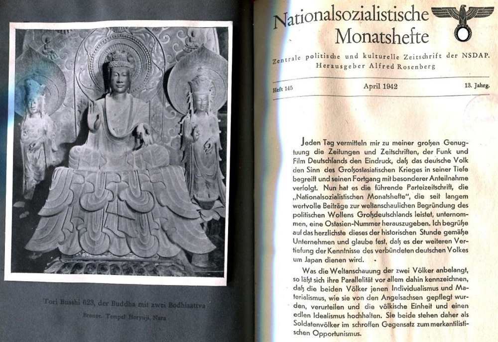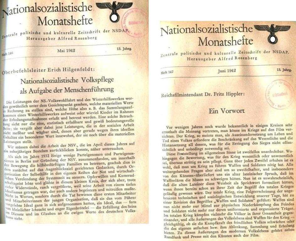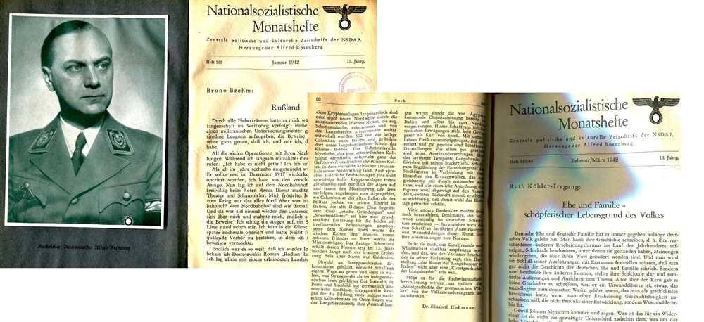 Aus dem Inhalt: Heft 142: Bruno Brehm: Rußland - Karl Rosenfelder: Europas Ostfront in der Geschichte (Sicherung des europäischen Vorfeld des durch die Indogermanen und seine Gefährdung durch die Skythen / Die Germanen übernehmen die Ostfront / Die Hunnen über Europa / Die Wikinger gestalten den Ostraum / Der Mongolensturm / Die deutsch-schwedische Ostseestellung und das polnische Experiment / Moskau übernimmt das mongolische Erbe/ Die europäische Maske des Petersburger Imperiums - Der "roten Zar" bereitet den Angriff auf Europa vor - Der Gegenangriff Europas) - Gauleiter und Oberpräsident Hinrich Lohse: Ostland baut auf - Dr. Friedrich Alexander Redlich: Volkskunst und Brauchtum der Völker im Ostland, u.v.m. Heft 143 / Heft 144: Ruth Köhler-Irrgang: Ehe und Familie, schöpferische Lebensgrund des Volkes - Wilhelm von Humboldt an seine Frau Caroline - Dr. Else Vorwerck: Leistungssteigerung und Rationalisierung in der Hauswirtschaft - Waltraud Zilius-Falkenberg: Aufgaben der Frau in der gegenwärtigen deutschen Kulturarbeit - Inge Schrade: Gesichter deutscher Frauen - Alice Rilke: Frauenberufstätigkeit - Inge Stade: Gesichter deutscher Frauen - Dr. Anna Kottenhoff: Wert und Bedeutung des Frauenstudiums - Dr. Magda Menzerath: Europäische Frauenorganisationsformen - Ruth Köhler-Irrgang: An die Halben (Gedicht) - Eleonore Lorenz: Abendstille / Brücke und Straße / Gemeinschaft (Gedichte) - Tänzerin: Statue von Kolbe (Gedicht) von Elli Ruttke - Kritik der Zeit: Seegeltung oder Kontinentalpolitik?, von Dr. Otto Bittner - Karlheinz Rüdiger: Politisches Tagebuch. Der Kampf um die Freiheit des ostasiatischen Lebensraumes - "Der unmögliche Krieg mit Japan" - Dr. Walter Flemmig: Engpässe der britischen Rüstungswirtschaft - Dr. Eberhard Achterberg: "Denn wär nicht der Bauer . . . "- Kleine Kulturberichte: Herwarth von Renesse, Dr. Todt (Nachruf) - Bernhard Kummer: Wilhelm Teudt (Nachruf) - Dr. Eberhard Achterberg: Stammesgeschichte als Reichsgeschichte - Dr. Nausikaa Fischer: Um den Kulturfilm - Dr. Bernhard Payr: Schriftumschau u.a. große Roman-Preisausschreiben des "Völkischen Beobachters" - ganzseitige Anzeige "Volkspflegerische Arbeit in der NSV. ist Dienst am Leben des Volkes" (Werbung für Frauenberufe wie Krankenschwester, Gemeindeschwester, Säuglings- und Kinderschwester, Kinderpflegerin, Kindergärtnerin, Jugendleiterin und Volkspflegerin), u.v.m. Heft 145: Geleitwort des Kaiserlich Japanischen Botschafters Oshima - Fürst v. Urach: Das Wunder des japanischen Aufstiegs - Prof.Dr. Otto Kümmel: Nationaljapanisches in der japanischen Kunst - Dr. Walter Donat: Das Werden des japanischen Geistes - Major z. V. Otto Mossdorf: Japans Wehrmacht - Erich Schrock: Das Land der Thai - ganzseitiger Nachruf auf Waldemar Hartmann, u.v.m. Heft 146: Oberbefehlsleiter Erich Hilgenfeldt: Nationalsozialistische Volkspflege als Aufgabe der Menschenführung - Werner Daitz: Das europäische Sittengesetz als Strukturgesetz der europäischen Großraumwirtschaft - Prof. Dr. Erich Maschke: Die Verteidigung Europas - Dr. Walter Holtz: Die Einheit Europas in der bildenden Kunst - Generalsarbeitsführer Karoly Kampmann: Idee der Jugend. Eine grundsätzliche Betrachtung über den Aufbau von Arbeitsdienst in den europäischen Ländern - Kritik der Zeit: Dr. H .von Rennesse: Die Persönlichkeit in der gelenkten Wirtschaft - Fritz Peuckert: Germanische Besinnung und Aufbruch in flämischen und holländischen Zeitschriften, u.v.m. Heft 147: Reichsfilmintendant Dr. Fritz Hippler: Ein Vorwort - Emil Jannings: Über den Film. Aus einer Rundfunk-Reden zu seinem Film: "Ohm Krüger" - Wolfgang Liebeneiner: Film-Regie - Rolf Lauckner: Über die Grenze zwischen Film und Schauspiel -Arnold Fanck: Der Kultur-Spielfilm. Eine Filmgattung, deren Möglichkeiten und Werte noch nicht erkannt wurden - Frank Maraun: Kamera an der Front - Gedichte von Hans Pflug-Franken - Kritik der Zeit. Walter Zimmermann: Mit Alfred Rosenberg durch Russland - Dr. Walter Flemmig: Engpässe der USA-Kriegsproduktion - Joachim W. Hartnack: The American Spirit - Robert Scholz: Fritz Höger, der niederdeutsche Backsteinbaumeister - Rembert Ramsauer: Nach dem Gedenken Paracelsus) - Dr. G Westenburger: Alexander Cartellieri - Dr. Heinz Oeppert: G. C.Lichtenberg zum 200.Geburtstag - Dr. Kurt Wortig: Zwischen Atelier und weißer Wand, Film und Journalismus - Dr. Nausikaa Fischer: Schauspiel in Berlin / Betrachtungen zum Filmschaffen - Dr. von Werder: Schriftumschau Elsass und Lothringen im neuen Schrifttum, von Doktor Heinz Oeppert - Wissenschaft um Krieg und Reich, von Arbeitsführer Dr. Otto Bittner - Arzt im Kampf, u.v.m. 1942, Zentrale politische und kulturelle Zeitschrift der N.S.D.A.P., Verlag Frz. Eher Nachf., GmbH, München, Halbleinen im Festband mit Goldprägung, 416 Seiten mit farbigen und s/w Abb., Seiten altersbedingt gebräunt aber gut lesbar, Einband bestoßen und löst sich vom Rücken, Wasserschaden, stark wellig und fleckig, roter Stempel mit: Staatl. Hochschule für Musikerziehung u. Kirchenmusik Berlin - Charlottenburg auf zahlr. Seiten, Vorsatz mit Eintragung siehe Abb., Zustand: IV-V