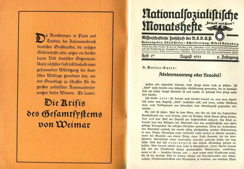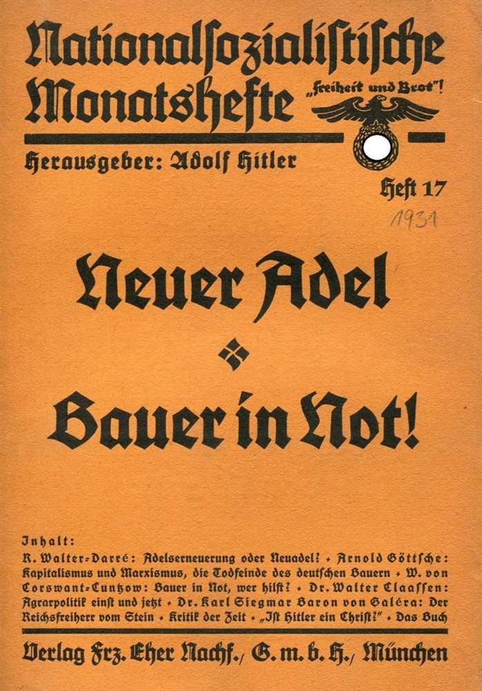 Aus dem Inhalt: Neuer Adel - Bauer in Not; Darrè: Adelserneuerung oder Neuadel?; Göttsche: Kapitalismus und Marxismus, die Todfeinde des deutschen Bauern; Corswant-Cuntzow: Bauer in Not, wer hilft?; Classen: Agrarpolitik einst und jetzt; Dr. Karl Siegmar Baron von Baléra: Der Reichsfreiherr vom Stein; Ist Hitler ein Christ?; Kritik der Zeit; Das Buch; Herausgeber: Adolf Hitler. 1931, Verlag Frz. Eher Nachf., GmbH, München, Broschur, 48 Seiten, Einband leicht bestoßen und mit Bleistift Eintragung, Zustand: II-III /