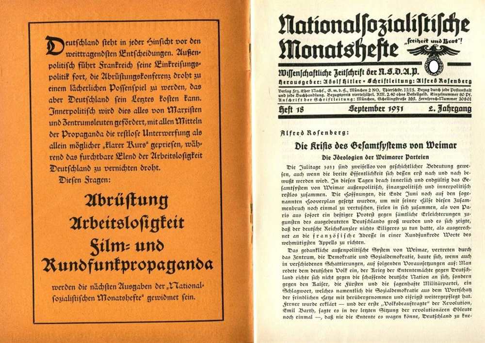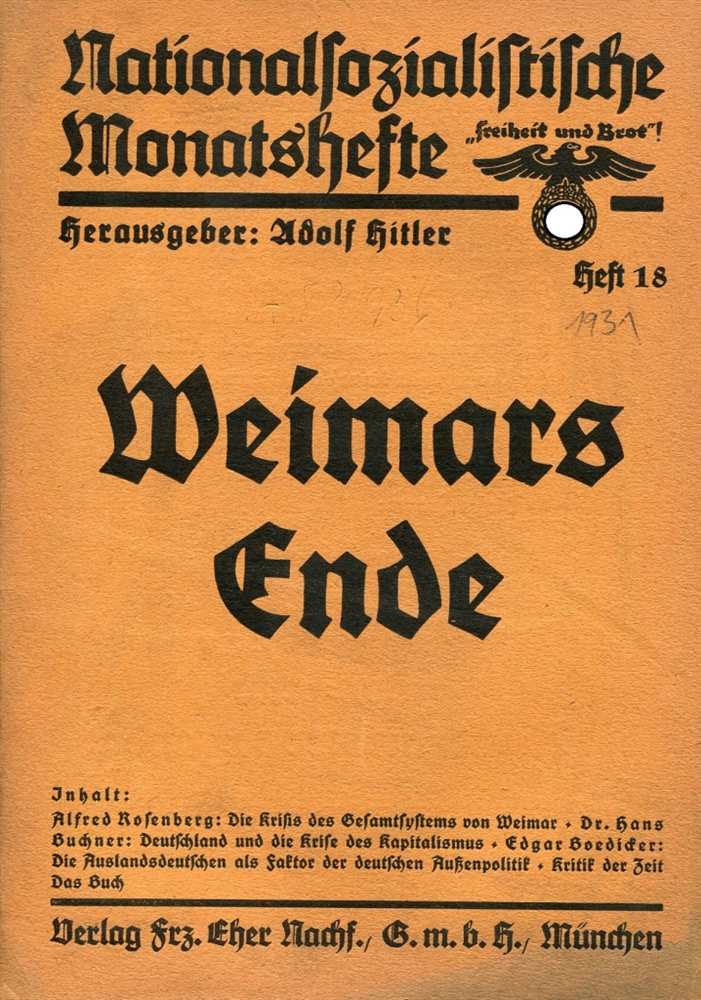 Aus dem Inhalt: Weimars Ende; Alfred Rosenberg: Die Krisis des Gesamtsystems von Weimar. Die Ideologien der Weimarer Parteien -Dr. Hans Buchner: Deutschland und die Krise des Kapitalismus - Edgar Boedicker: Die Auslandsdeutschen als Faktor der deutschen Außenpolitik - Kritik der Zeit (Armut und Autarkie / "Der Fall Ludendorff" / Die nationale Frage und die Sozialdemokratie / Die Brotpolonaise); Kritik der Zeit; Das Buch; Herausgeber: Adolf Hitler. 1931, Verlag Frz. Eher Nachf., GmbH, München, Broschur, 48 Seiten, Einband leicht bestoßen und mit Bleistift Eintragung, Einband löst sich vom Block und fleckig, Zustand: III-IV