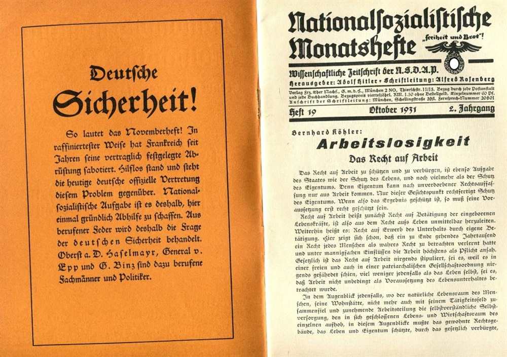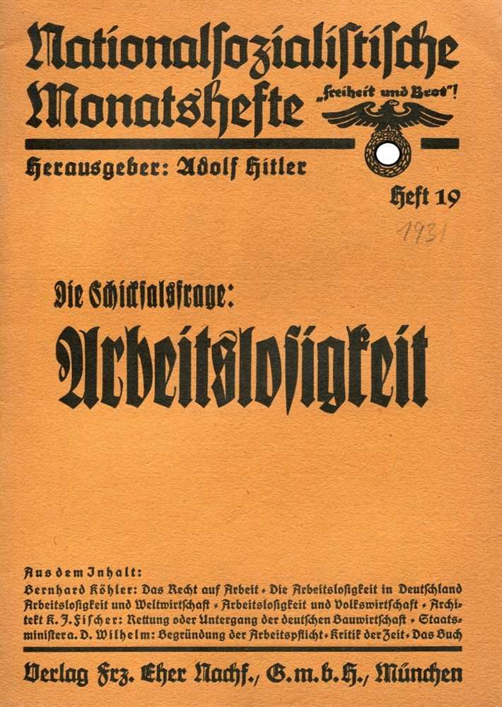 Aus dem Inhalt: Arbeitslosigkeit; Bernhard Köhler: Arbeitslosigkeit. Das Recht auf Arbeit / Die Arbeitslosigkeit in Deutschland (Vor dem Krieg / Konjunktur-Änderung / Unerkannte Wandlungen / Proletarische Arbeitslosigkeit / Nach dem Kriege / Unterstützungsempfänger / Betroffene Berufe / Einheitliche Tendenz / Inflation / Kapitalentziehung / Aussichten) - Arbeitslosigkeit und Weltwirtschaft ("Weltverbundenheit" / Schuldengemeinschaft / Kredit ist unrationell / Internationale Arbeitslosigkeit / Außenhandel / Welt-und Goldkrise / Schulden und Tribute) - Arbeitslosigkeit und Volkswirtschaft (Kapitalverschleuderung / Überproduktion? / Fehlleitung / Zusätzliche Arbeit / Und das Geld?) - Architekt H.J. Fischer: Um die deutsche Bauwirtschaft - Begründung der Arbeitspflicht; Kritik der Zeit; Das Buch; Herausgeber: Adolf Hitler. 1931, Verlag Frz. Eher Nachf., GmbH, München, Broschur, 48 Seiten, Einband leicht bestoßen und mit Bleistift Eintragung, Zustand: II-III