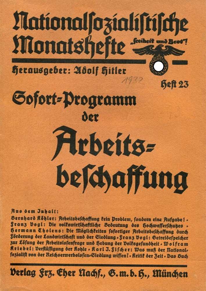 Aus dem Inhalt: Sofort-Programm der Arbeitsbeschaffung; Köhler: Arbeitsbeschaffung kein Problem, sondern eine Aufgabe!; Vogl: Die volkswirtschaftliche Bedeutung des Hochwasserschutzes; Tholens: Die Möglichkeiten sofortiger Arbeitsbeschaffung durch Förderung der Landwirtschaft und der Siedlung; Vogl: Getreidespeicher zur Lösung der Arbeitslosenfrage und Hebung der Volksgesundheit; Kriebel: Verflüssigung der Kohle; Fischer: Was muss der Nationalsozialist von der Reichserwerblosen-Siedlung wissen?; Kritik der Zeit; Das Buch; Herausgeber: Adolf Hitler. 1932, Verlag Frz. Eher Nachf., GmbH, München, Broschur, 48 Seiten, Einband leicht bestoßen und mit Bleistift Eintragung, Zustand: II-III