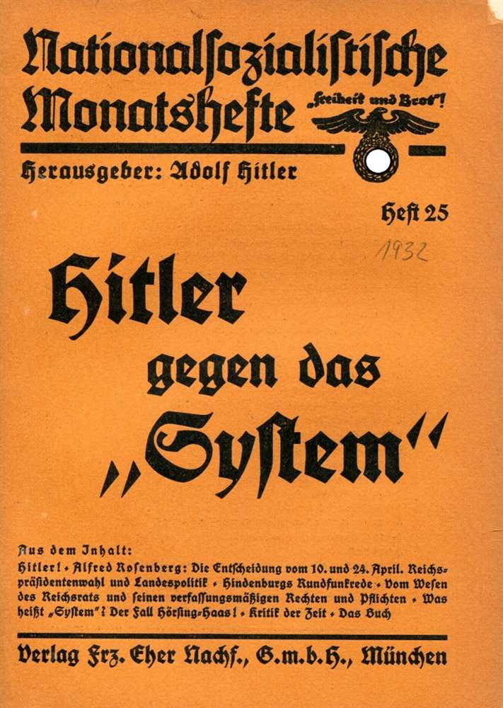 Aus dem Inhalt: Bildnis Hitler; Hitler gegen das "System"; Rosenberg: Die Entscheidung vom 10. und 24. April Reichspräsidentenwahl und Landespolitik; Hindenburgs Rundfunkrede; Vom Wesen des Reichsrats und seinen verfassungsmäßigen Rechten und Pflichten; Was heißt "System"; Der Fall Görsing-Haas!; Kritik der Zeit; Das Buch; Herausgeber: Adolf Hitler. 1932, Verlag Frz. Eher Nachf., GmbH, München, Broschur, 48 Seiten, Einband leicht bestoßen und mit Bleistift Eintragung, Zustand: II-III