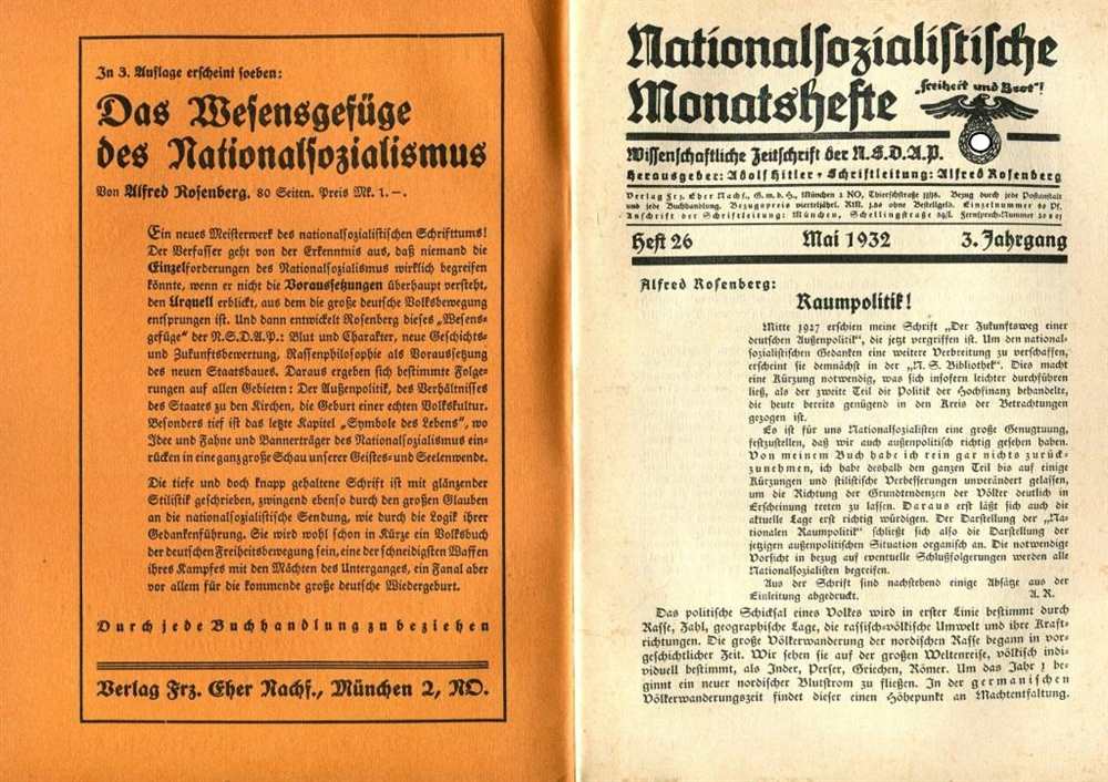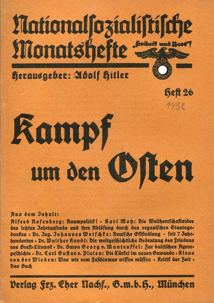 Aus dem Inhalt: Kampf um den Osten; Rosenberg: Raumpolitik; Motz: Die Weltherrschaftsidee des letzten Jahrtausends und ihre Ablösung durch den organischen Staatsgedanken; Wotschke: Deutsche Ostsiedlung - seit 7 Jahrhunderten; Kundt: Die weltgeschichtliche Bedeutung des Friedens von Brest; Manteufel: Zur baltischen Agrargeschichte; Platen: Die Türkei im neuen Gewande; Wieden: Was wir vom Faschismus wissen müssen; Kritik der Zeit; Das Buch; Herausgeber: Adolf Hitler. 1932, Verlag Frz. Eher Nachf., GmbH, München, Broschur, 48 Seiten, Einband leicht bestoßen und mit Bleistift Eintragung, Zustand: II-III