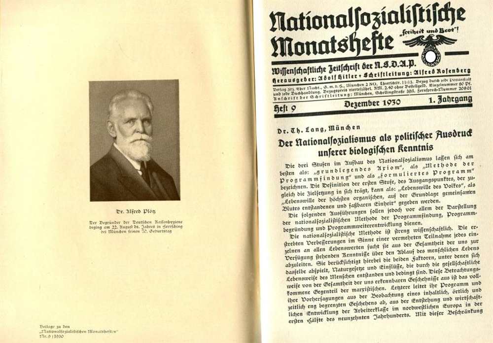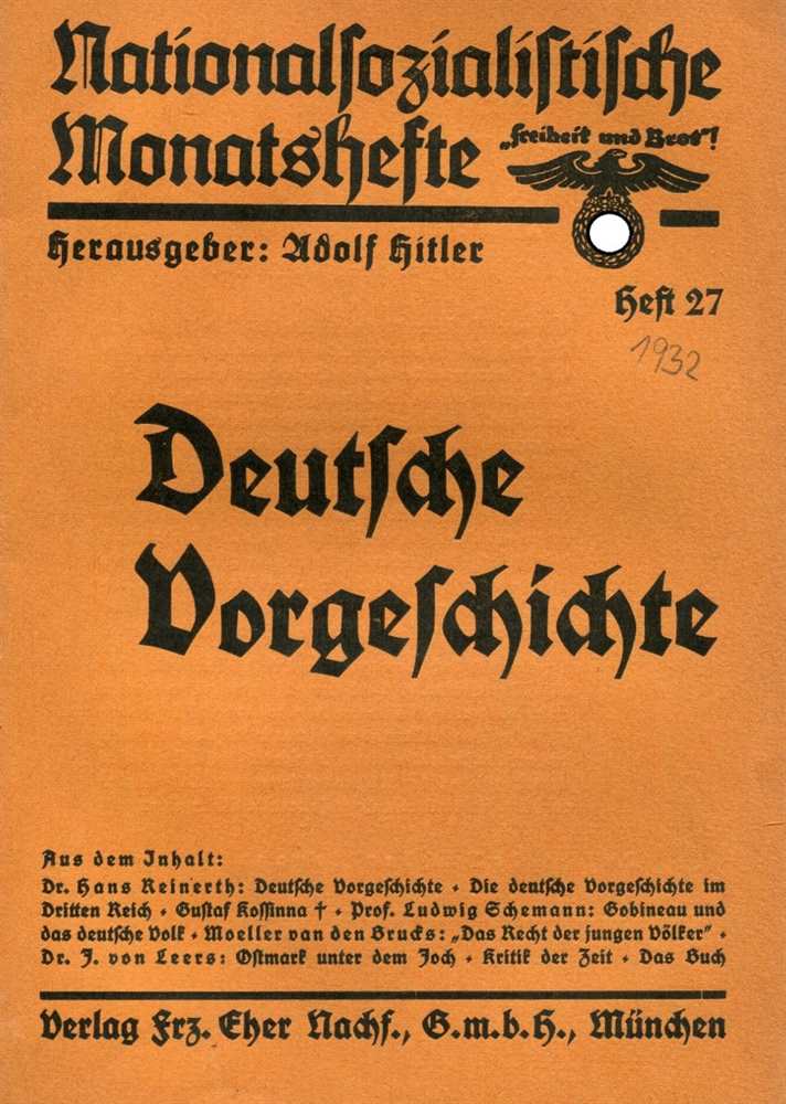 Aus dem Inhalt: Deutsche Vorgeschichte; Dr. Hans Reinerth: Die deutsche Vorgeschichte im Dritten Reich; Dr. Hans Reinerth: Gustav Kossinna +; Prof. Ludwig Schemann: Gobineau und das deutsche Volk; "Das Recht der jungen Völker"; Dr. Johann von Leers: Ostmark unter dem Joch; Kritik der Zeit; Das Buch; Herausgeber: Adolf Hitler. 1932, Verlag Frz. Eher Nachf., GmbH, München, Broschur, 48 Seiten mit s/w Abb., Einband leicht bestoßen und mit Bleistift Eintragung, Zustand: II-III
