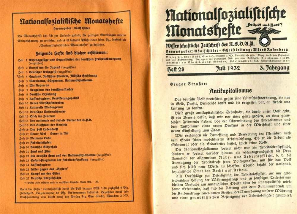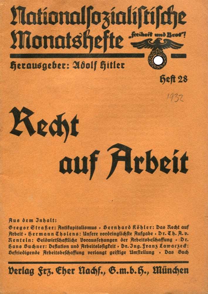 Aus dem Inhalt: Recht auf Arbeit; Straßer: Antikapitalismus; Köhler: Das Recht auf Arbeit; Tholens: Unsere vordringlichste Aufgabe; Renteln: Geldwirtschaftliche Voraussetzungen der Arbeitsbeschaffung; Buchner: Deflation und Arbeitslosigkeit; Lawazzeck: Befriedigende Arbeitsbeschaffung verlangt geistige Umstellung; Kritik der Zeit; Das Buch; Herausgeber: Adolf Hitler. 1932, Verlag Frz. Eher Nachf., GmbH, München, Broschur, 48 Seiten mit s/w Abb., Einband leicht bestoßen und mit Bleistift Eintragung, Zustand: II-III