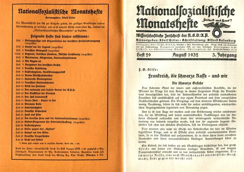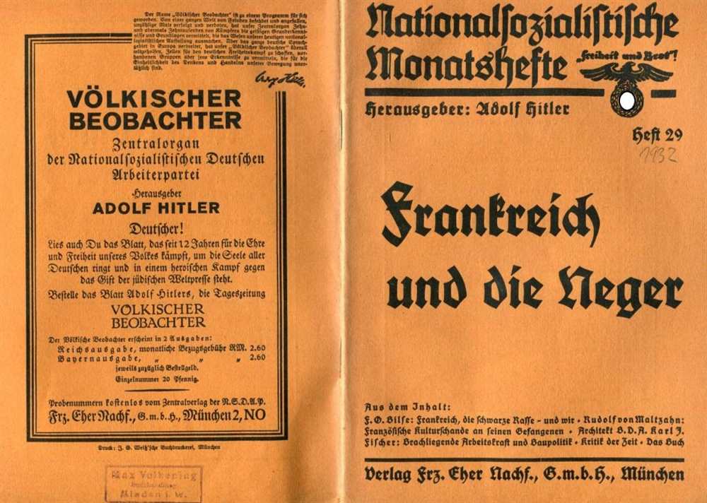 Aus dem Inhalt: Frankreich und die Neger; Bilse: Frankreich, die schwarze Rasse und wir; Rudolf von Maltzahn: Französische Kulturschande an seinen Gefangenen; Karl J. Fischer: Brachliegende Arbeitskraft und Baupolitik; Hans Buchner: Der neue Francqui-Plan, Arbeitsdienst oder Arbeitsbeschaffung; Franz Vogel: Wie das Bauen Beschäftigung und Steuern bringt, Vgl., Bayern und die Reichsmittel.; Kritik der Zeit; Das Buch; Herausgeber: Adolf Hitler. 1932, Verlag Frz. Eher Nachf., GmbH, München, Broschur, 48 Seiten mit s/w Abb., Einband leicht bestoßen und mit Bleistift Eintragung, Einband hinten: Stempel Max Volkening, Zustand: II-III