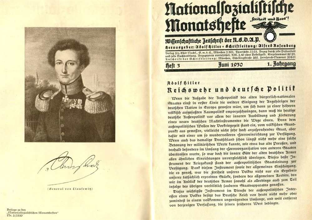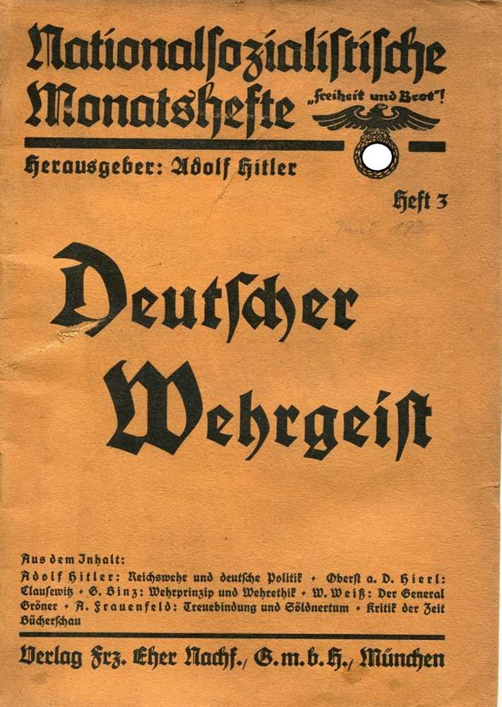 Aus dem Inhalt: Deutscher Wehrgeist; Adolf Hitler, Reichswehr und deutsche Politik; Oberst a. D. Hierl: Clausewitz; Binz: Wehrprinzip und Wehrethik; Weiß: General Gröner; Frauenfeld: Treuebindung und Söldnertum; Kritik der Zeit; Bücherschau. Herausgeber: Adolf Hitler. 1930, Verlag Frz. Eher Nachf., GmbH, München, Broschur, 56 Seiten, Einband leicht bestoßen und mit Bleistift Eintragung, Zustand: II-III