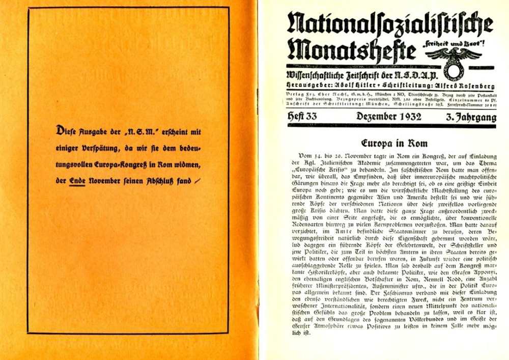 Aus dem Inhalt: Krihs Europa; Europa in Rom; Rosenberg: Krisis und Neugeburt Europas; Giulano: Der ideelle Gedanke im Faschismus; Maltzahn: Sinn und Bedeutung des Europa-Kongresses in Rom; Bezeichnende Vorträge auf dem Europa-Kongreß in Rom vom 14.-20. November 1932; Frankreichs Bündnispolitik bedroht Europa; Kritik der Zeit; Das Buch; Herausgeber: Adolf Hitler. 1932, Verlag Frz. Eher Nachf., GmbH, München, Broschur, 48 Seiten mit s/w Abb., Einband bestoßen und mit Bleistift Eintragung, Zustand: II-III