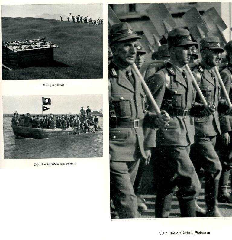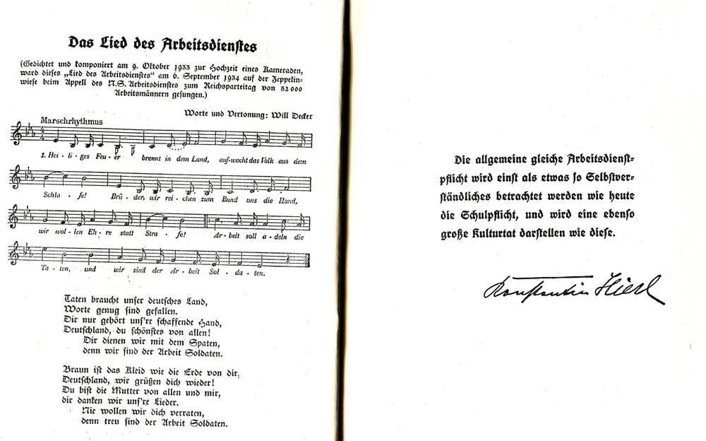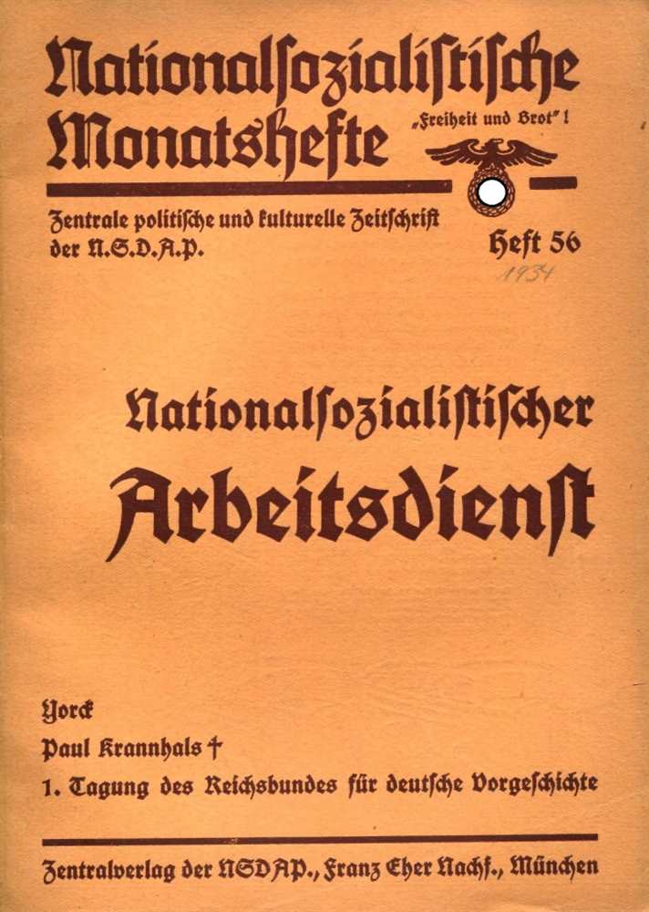 Aus dem Inhalt: Das Lied des Arbeitsdienstes, von will Decker / Vorwort des Reichsarbeitsführers / Arbeitsführer Herbert Erb (Adjutant des Reichsarbeitsführers): Konstantin Hierl / Hanns Seitz: Treugelöbnis des Arbeitsdienstes. Zum 29. Juni 1934, dem unvergesslichen Tage, da der Führer in Westfalen den Arbeitsdienst besuchte (Gedicht) / Hans Hano: Neuland der Kommenden / Gauarbeitsführer Rolf von Gönner (Leiter des Dienstamtes der Reichsleitung): Die organisatorische Entwicklung des Arbeitsdienstes / Gauarbeitsführer Dr. Will Decker (Inspekteur des Erziehungs- und Bildungswesens): Staatspolitische Erziehung im Arbeitsdienst / Gauarbeitsführer Hans Surén (Inspekteur für Leibeserziehung des Arbeitsdienstes): Die Leibeserziehung im Arbeitsdienst / Gauarbeitsführer Freiherr Loeffelholz von Colberg: Vom Führertum im Arbeitsdienst / Das Lied vom Spaten ("Der Spaten in des Mannes Hand", von Konrad Liß, Vertonung: Kurt von Hertzberg / Gauarbeitsführer Tholens (Leiter des Planungsamtes der Reichsleitung im RAD): Die Wirtschaftlichkeit des Arbeitsdienstes / Oberarbeitsführer Friedrich Wunderlich: Die Wirtschaftlichkeit des Arbeitsdienstes beim Bau des Schutter-Entlastungskanals in Baden / Arbeitsführer Dr.-Ing. Harry Rutz: Die Wirtschaftlichkeit des Arbeitsdienstes bei Landgewinnung und Moorkultur / "Arbeitsdienst", Gedicht von Dr. Will Decker an den Reichsarbeitsführer / Gauarbeitsführer Hermann Kretzschmann (Leiter der Reichsschule des deutschen Arbeitsdienstes in Potsdam): Der staatspolitische Unterricht im Arbeitsdienst / Gauarbeitsführer Dr.jur. Herbert Schmeidler (Leiter des Verwaltungs- und Wirtschaftsamtes in der Reichsleitung): Die Verwaltung im Arbeitsdienst / Gauarbeitsführer Dr. von Funcke (Leiter des Rechtsamtes in der Reichsleitung): Der verwaltungsrechtliche Aufbau des Arbeitsdienstes / Konrad Liß: Lied der Bauern / Reichsarbeitsarzt Dr. Schuster: Die Aufgaben des Arztes im Arbeitsdienst / Maria Burgstaller (Reichsschulungsleiterin des Frauenarbeitsdienstes): Deutscher Frauenarbeitsdienst - Eberhard Hübner: Das Werksoldatenlied / Arbeitsführer Müller-Brandenburg (Leiter des APA der Reichsleitung): Das Aufklärungs- und Presseamt beim Reichskommissar für den freiwilligen Arbeitsdienst / Arbeitsführer Karoly Kampmann (Pressechef des Arbeitsdienstes): Presse und Arbeitsdienst / Oberstfeldmeister Paul Beintker (Referent im Aufklärungs- und Presseamt der Reichsleitung): Arbeitsdienst und Ausländer / Hermann Grauerholz-Bremerhaven: Es griff ein Volk zum Spaten / Geschichten aus dem Arbeitsdienst; Kritik der Zeit; Das Buch. 1934, Verlag Frz. Eher Nachf., GmbH, München, Broschur, 96 Seiten mit s/w Abb., Seiten altersbedingt leicht gebräunt, alle Seiten fest am Block und lesbar, Einband bestoßen und löst sich vom Block, Bleistift Eintragung, Zustand: III-IV