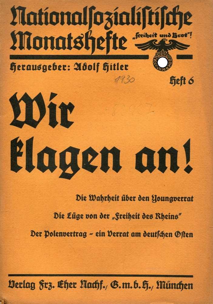 Aus dem Inhalt: Wir klagen an! Gottfried Feder: Betrachtungen zum Youngplan; Wilhelm Weiß: Der rheinische Pufferstaat; Dr. Theobald Frhr. v. Reck: Ost - Locarno?; Streiflichter; Generalmajor a. D. Fritz Bauer: Das amerikanische Alkoholverbot; Kritik der Zeit; Bücherschau. Herausgeber: Adolf Hitler. 1930, Verlag Frz. Eher Nachf., GmbH, München, Broschur, 48 Seiten, Einband leicht bestoßen und mit Bleistift Eintragung, Zustand: I-II