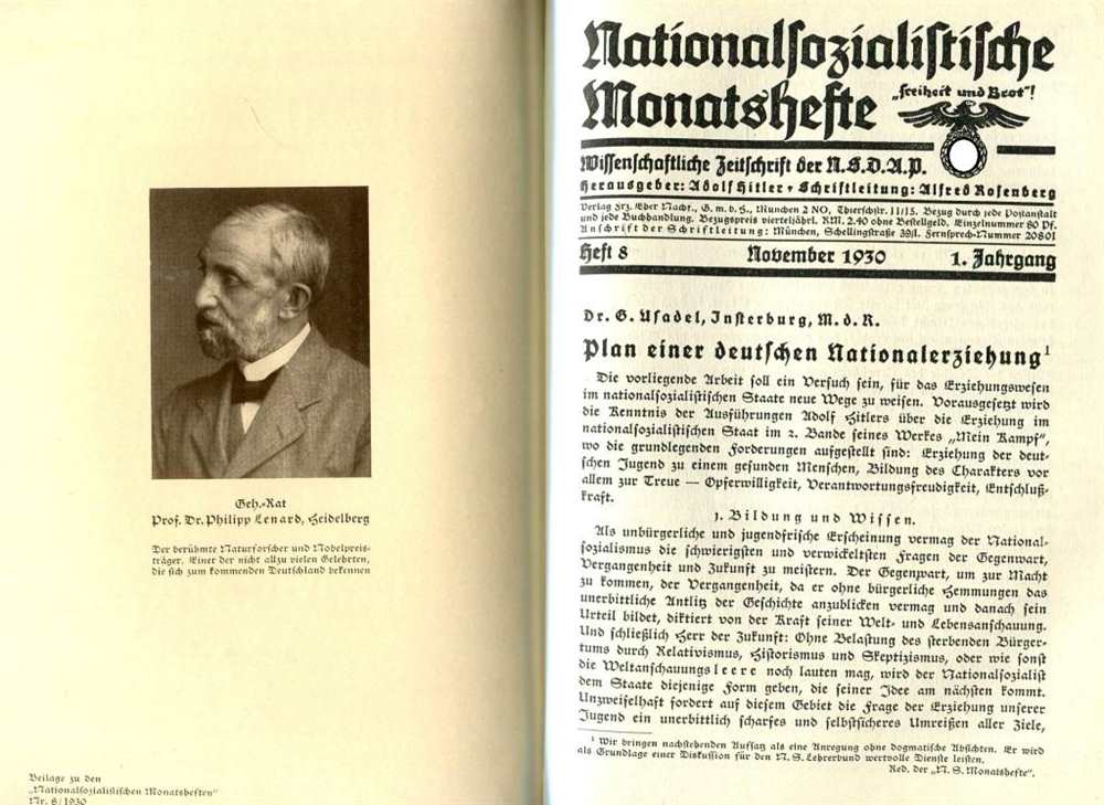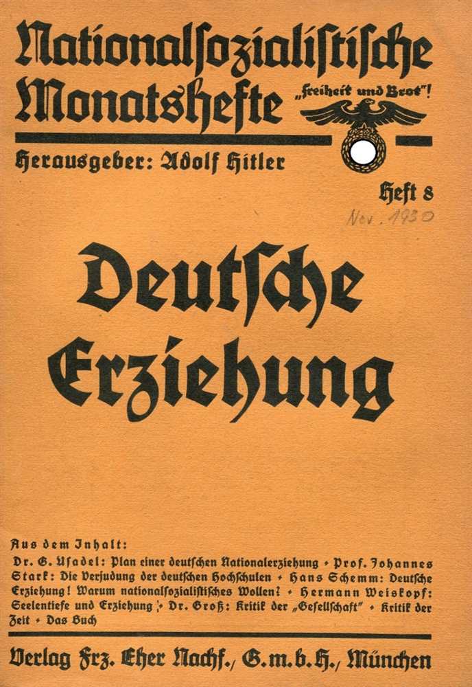 Aus dem Inhalt: Deutsche Erziehung; Usadel: Plan einer deutschen Nationalerziehung; Stark: Die Verjudung der deutschen Hochschulen; Schemm: Deutsche Erziehung; Weißkopf: Seelentiefe und Erziehung; Groß: Kritik der Gesellschaft; Kritik der Zeit; Bücherschau. Herausgeber: Adolf Hitler. 1930, Verlag Frz. Eher Nachf., GmbH, München, Broschur, 48 Seiten, Einband leicht bestoßen und mit Bleistift Eintragung, Stempel: Institut für politische Pädagogik an der Universität Berlin, Zustand: I-II