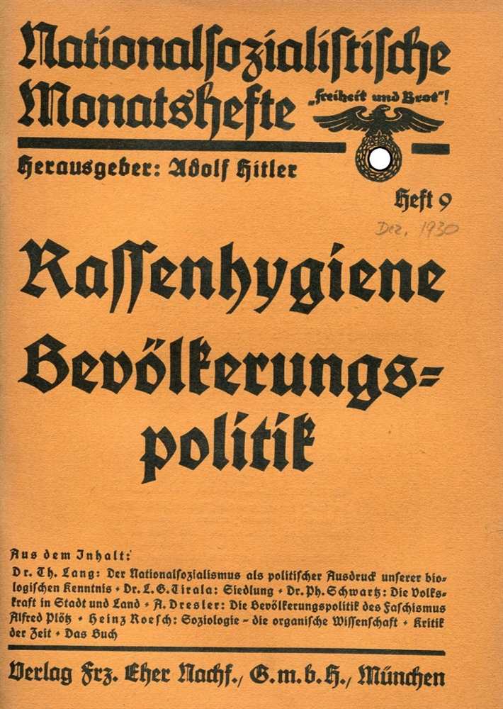 Aus dem Inhalt: Rassenhygiene Bevölkerungspolitik; Lang: Der Nationalsozialismus als politischer Ausdruck unserer biologischen Kenntnis; Tirala: Siedlung; Schwarz: Die Volkskraft in Stadt und Land; Dresler: Die Bevölkerungspolitik des Faschismus; Alfred Plötz; Roesch: Soziologie - die organische Wissenschaft; Kritik der Zeit; Bücherschau. Herausgeber: Adolf Hitler. 1930, Verlag Frz. Eher Nachf., GmbH, München, Broschur, 48 Seiten, Vorsatzblatt löst sich, Einband leicht bestoßen und mit Bleistift Eintragung, Zustand: III-IV