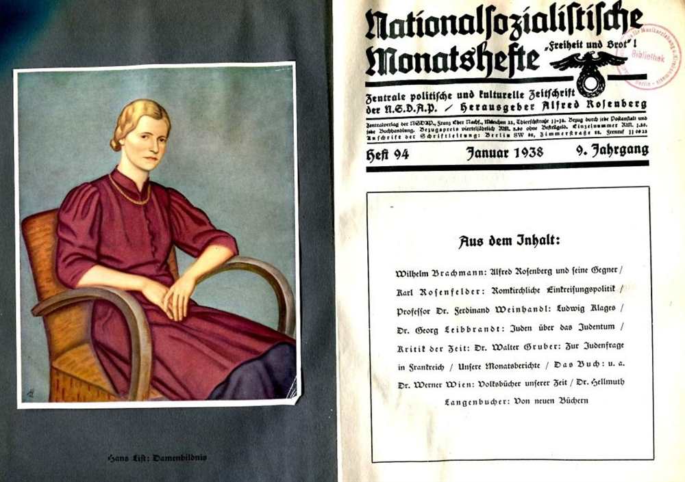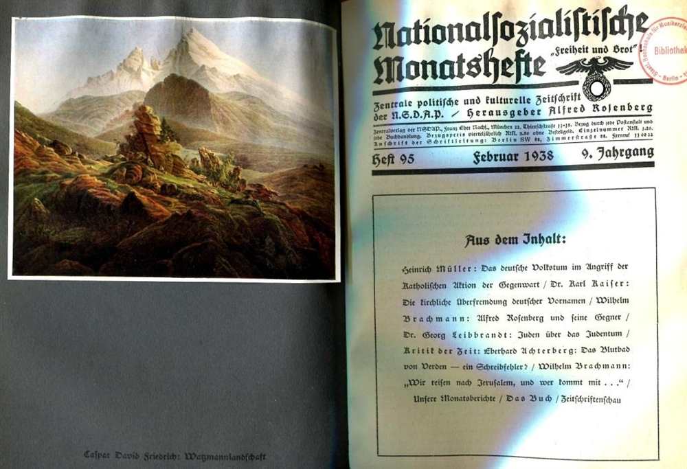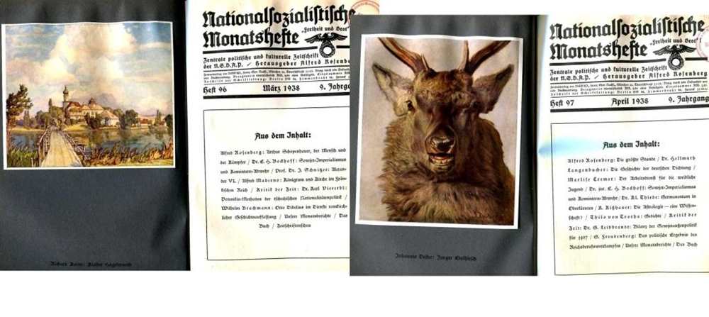 Aus dem Inhalt: Heft 94: Wilhelm Brachmann: Alfred Rosenberg und seine Gegner. Zur Auseinandersetzung mit den "Protestantischen Rompilgern" - Karl Rosenfelder: Romkirchliche Einkreisungspolitik. Zum Kampf gegen die nationalsozialistische Weltanschauung (Aufmarsch der Katholischen Aktion in den deutschen Nachbarländern / Kongresse und Kundgebungen gegen das Dritte Reich 1935-1937 / Internationales Turnfest der Katholischen Turnunion in Wien, 15. Kongress der Weltarbeitsgemeinschaft / Prof. Dr. Ferdinand Weinhandl: Ludwig Klages - Dr. Georg Leibbrandt: Juden über das Judentum - Dr. Walter Gruber: Zur Judenfrage in Frankreich, u.v.m. Heft 95: Heinrich Müller: Das deutsche Volkstum im Angriff der Katholischen Aktion der Gegenwart - Dr. Karl Kaiser: Die kirchliche Überfremdung deutscher Vornamen - Wilhelm Brachmann: Alfred Rosenberg und seine Gegner - Dr. G. Leibbrandt: Juden über das Judentum - E. Achterberg: Das Blutbad von Verden - ein Schreibfehler? u.v.m. Heft 96: Alfred Rosenberg: Arthur Schopenhauer, der Mensch und der Kämpfer / Bockhoff: Sowjet-Imperialismus und Komintern-Abwehr. Weltangreifer Moskau - Prof. Dr. Josef Schnitzer: Alexander VI. - Alfred Maderno: Königtum und Kirche im Fränkischen Reich - Kritik der Zeitpunkt. Dr. Karl Viererbl: Potemkin-Methoden der tschechischen Nationalitätenpolitik - Wilhelm Brachmann: Otto Dibelius im Dienste romkirchlicher Geschichtsauffassung, u.v.m. Heft 97: Dr. H. Langenbucher: Die Geschichte der deutschen Dichtung - Marlise Cremer: Der Arbeitsdienst für die weibliche Jugend - Dr. jur. E.H. Bockhoff: Sowjet-Imperialismus und Komintern-Abwehr (Fortsetzung) - Dr. Kl. Thiede: Germanentum in Oberkärnten - K. Kitzbauer: Die Astrologie eine Wissenschaft? - Thilo von Trotha: Gedichte - G. Freudenberg: Das politische Ergebnis des Reichsberufswettkampfes (Der nationalsozialistische Leistungstyp / Die sozialistische Leistungsauslese / Die Leistungssteigerung, u.v.m. Heft 98: Alfred Rosenberg: Gestalt und Leben - Dr. K. Viererbl: Der Betrug mit dem Selbstbestimmungsrecht der Völker - Dr. Bruno Kroll: Vom Wandel der jüngeren deutschen Plastik zu neuer Monumentalität - K. Th. Weigel: Sinnbild und Glaube - Dr. H. Langenbucher: Die Geschichte der deutschen Dichtung - Briefe des Kampfes und des Glaubens - Neue Lyrik - Unsere Monatsberichte - Anzeigenteil - "Die Monatsschrift hat sich zur Aufgabe gestellt, die geistigen Grundlagen unserer Weltanschauung zu vertiefen, und es ist deshalb Pflicht eines jeden Nationalsozialisten, laufend die nationalsozialistischen Monatshefte zu beziehen" (aus der Verlagswerbung), u.v.m. Heft 99: Der Moskauer Prozess im Lichte des völkischen Kampfes - Dr. Willi Fr. Könitzer: Die Hitlerjugend als Träger kulturpolitischer Aufgaben (Die Feiergestaltung / Freizeitgestaltung / Musikarbeit der Hitlerjugend / Volkstumsarbeit / Spielschararbeit / HJ.-Rundfunk / Bildende Kunst und Heimbau / Kulturarbeit der Mädel / Schriftarbeit / Veranstaltungsring der HJ / Theaterarbeit) - Max Wegner: Tilman Riemenschneider. Der Mensch, das Werk und seine Zeit - Karlheinz Rüdiger: Friedrich Hebbel - "Das Lied der Getreuen" (Gedichte.) Bekenntnis zum Führer / Sein Einsatz! / Österreichs Mütter / Gemeinschaft / Sonnenwende, u.v.m. 1938, Zentrale politische und kulturelle Zeitschrift der N.S.D.A.P., Verlag Frz. Eher Nachf., GmbH, München, Halbleinen im Festband mit Goldprägung, 576 Seiten mit farbigen und s/w Abb., Seiten altersbedingt gebräunt aber gut lesbar, Einband bestoßen und löst sich vom Rücken, leichter Wasserschaden und fleckig, roter Stempel mit: Staatl. Hochschule für Musikerziehung u. Kirchenmusik Berlin - Charlottenburg auf zahlr. Seiten, Zustand: IV-V