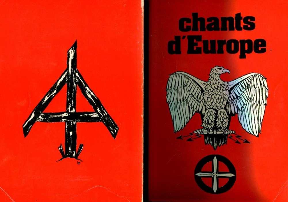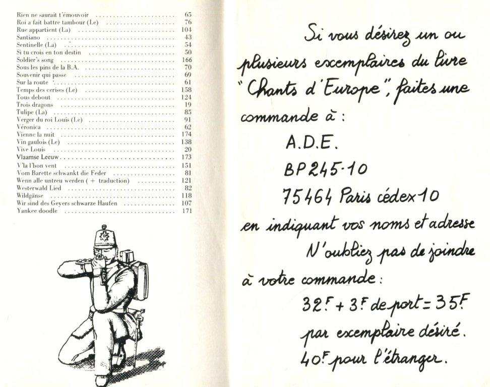 Chants d'Europe : à nos camarades Jean Prévost et Robert Brasillach fraternels adversaires, Roger Degueldre et tant d'autres, morts pour l'Europe nouvelle. Contenu : Chansons d'histoire, de mer, de guerre, de tradition, de bataille, de bivouac et de nourriture, et bien plus encore. Français, sans date, vers 1973, A.D.E., Paris, couverture souple, 181 pages avec de nombreuses photos et illustrations en noir et blanc, couverture bosselée et froissée, pages intérieures en très bon état, page de garde avec dédicace, état : I-III