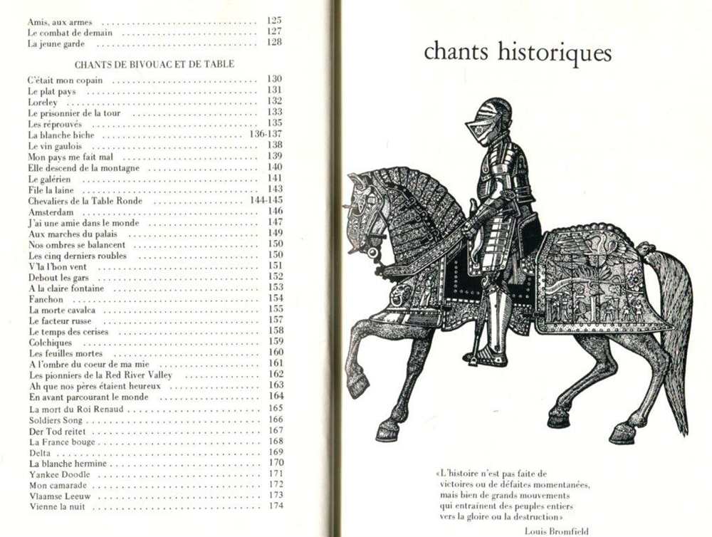 Lieder Europas: An unsere Kameraden Jean Prévost und Robert Brasillach, unsere brüderlichen Gegner, Roger Degueldre und so viele andere, die für das neue Europa gestorben sind. Inhalt: Lieder der Geschichte, dem Meer, dem Krieg, der Tradition, dem Kampf, vom Biwak und Essen, u.v.m. Französisch, ohne Jahresangabe um 1973, A.D.E., Paris, Broschur gebunden, 181 Seiten mit zahlr. s/w Fotos und Abb., Einband bestoßen und knicke, Innenseiten sehr gut, Vorsatz mit Widmung, in französischer Sprache, Zustand: I-III