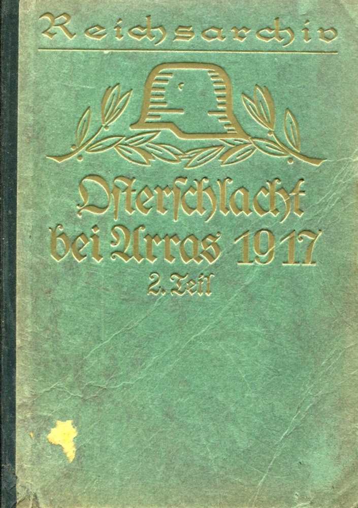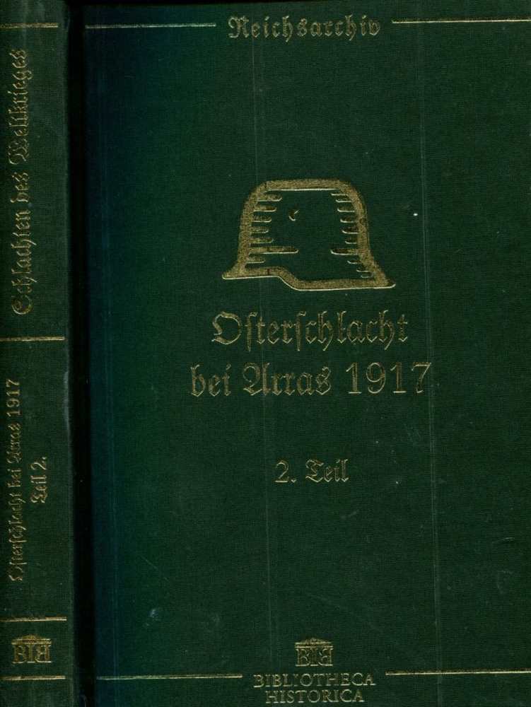 In Einzeldarstellungen bearbeitet und herausgegeben im Auftrage des Reichsarchivs. 2. Teil: Zwischen Scarpe und Bullecourt. Die Schlacht bei Arras, auf deutscher Seite als Frühjahrsschlacht oder auch Osterschlacht bei Arras" bezeichnet, war eine Schlacht an der Westfront des Ersten Weltkriegs, die vom 9. April bis zum 16. Mai 1917 geführt wurde. Dabei gelang es britischen und kanadischen Truppen, den deutschen Truppen einen strategischen Höhenzug bei Vimy abzunehmen, ohne einen entscheidenden militärischen Erfolg zu erringen. Letzterer Teil der Schlacht ging als Schlacht bei Vimy in die kanadische Geschichte ein. 2016 Nachdruck der Originalausgabe von 1929, Bibliotheca Historica, Gerhard Stalling, Berlin, Ganzleinen gebunden, transparent privat eingeschlagen mit Goldprägung, 208 Seiten mit s/w Abb. mit Skizzen/Karten (wie neu), Zustand: I