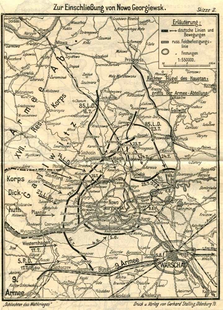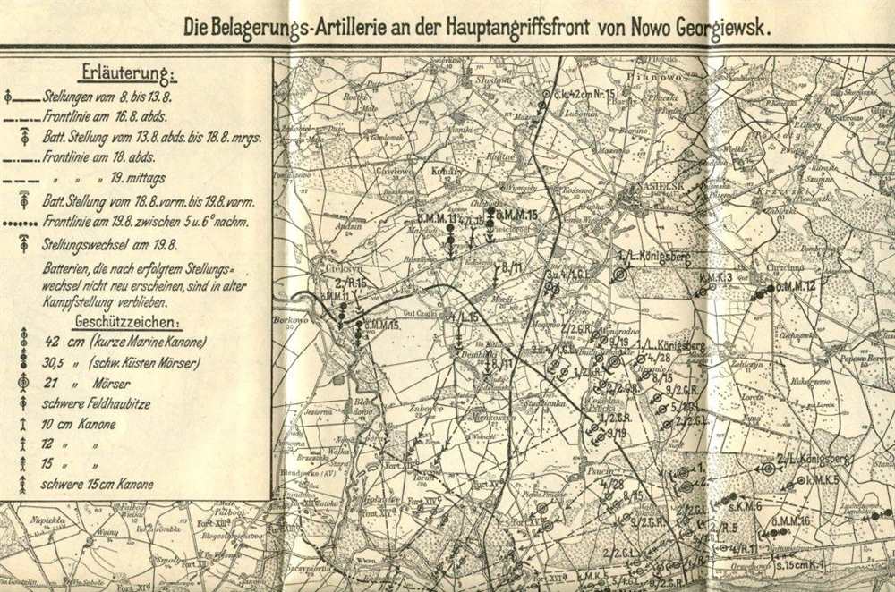 In Einzeldarstellungen bearbeitet und herausgegeben im Auftrage des Reichsarchivs, persönliche Aufzeichnungen von Mitkämpfern und einer Darstellung des Majors u. 1. Generalstabsoff. der Belagerungsarmee, v. Brunn. Da die russische Festung in relativ kurzer Zeit gefallen war, geriet der größte Teil der russischen Besatzung in deutsche Kriegsgefangenschaft. Außerdem fielen eine große Anzahl Geschütze und umfangreiche Vorräte an Munition und Lebensmitteln in die Hände der Sieger. Strategisch hatte der Sieg insofern Auswirkungen, als die Wasserstraßen der Weichsel und des Narew nun für die deutsche Militärführung nutzbar wurden, ferner auch die wichtige Eisenbahnstrecke Mława-Warschau. Die Truppen der Armeegruppe Beseler wurden nun zu anderer Verwendung frei, während das russische Heer beträchtliche Verluste erlitten hatte. 2. Auflage 1926 Band 8, Gerhard Stalling, Berlin, Halbleinen gebunden mit Goldprägung, 127 Seiten mit s/w Abb., Skizzen und Karten, Einband stark bestoßen und stark berieben, Innenseiten gut, Einband innen stockfleckig, Buchrücken löst sich, Zustand: III-V