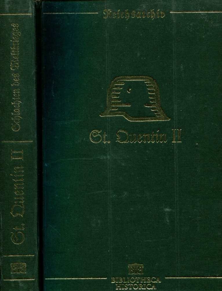 In Einzeldarstellungen bearbeitet und herausgegeben im Auftrage des Reichsarchivs. Der rechte Flügel der deutschen 2. Armee am 29. und 30. August. Die Schlacht bei St. Quentin (französisch: Bataille de Guise) war am Beginn des Ersten Weltkrieges eine Auseinandersetzung an der Westfront. An der Oise zwischen St. Quentin und Guise traf zwischen 28. und 30. August 1914 die deutsche 2. Armee unter Generaloberst Karl von Bülow auf einen überraschenden starken Gegenstoß der französischen 5. Armee unter General Charles Lanrezac. Die deutsche 2. Armee war zu Beginn der Schlacht am 28. August nach Abgabe des Garde-Reserve-Korps und des VII. Reserve-Korps (Schlacht um die Festung Maubeuge) noch etwa 230.000 Mann stark. Die französische 5. Armee war im Moment des Gegenangriffes mit fünf Korps zahlenmäßig überlegen, musste sich aber dennoch nach zweitägigen schweren Kämpfen zurückziehen. 2014, Nachdruck von 1925, Bibliotheca Historica, Gerhard Stalling, Berlin, Ganzleinen gebunden, transparent privat eingeschlagen mit Goldprägung, 251 Seiten mit s/w Abb. mit Skizzen/ Karten, Zustand: I-II