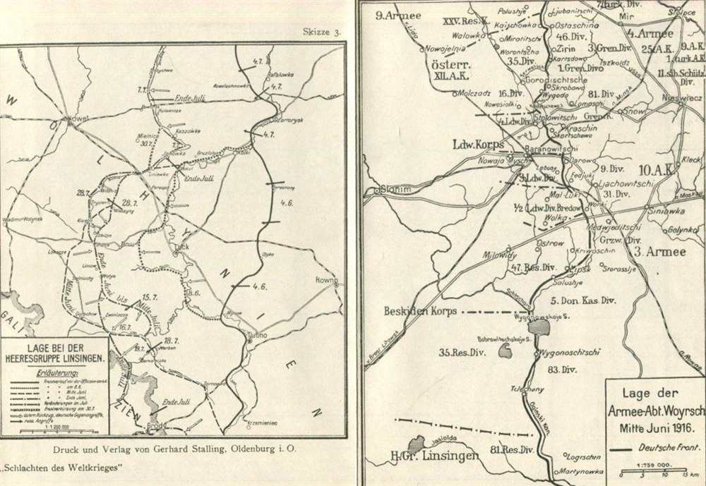 In Einzeldarstellungen bearbeitet und herausgegeben im Auftrage des Reichsarchivs. Die Baranowitschi-Offensive oder auch die Schlacht von Baranowitschi in Weißrussland führte im Juli 1916 zu einer verlustreichen Niederlage der Kaiserlich russischen Armee. Die Kampfräume der Baranowitschi-Offensive und der Brussilow-Offensive wurden durch die Prypjatsümpfe getrennt, die von beiden Seiten mit geringem Truppenaufwand zu halten und für weitreichende und umfassende militärische Aktivitäten ungeeignet waren. Am 5. Juli konnte auch beim Landwehrkorps nach der Wiedergewinnung der verlorenen Darowohöhe die Lage als wiederhergestellt betrachtet werden. Am 7. Juli wies die bei Kraschin-Odochowschschina angegriffene 4. Landwehr-Division die gegnerischen Durchbruchversuche ab. Zwischen 25. und 29. Juli 1916 erneuerten die russischen Truppen ihre Angriffe, welche von der 3. Landwehr-Division abermals abgeschlagen werden konnten. 2. Auflage 1924 Band 9, Gerhard Stalling, Berlin, Halbleinen gebunden mit Goldprägung, 76 Seiten mit s/w Abb. und Skizzen/ Karten, Einband bestoßen und berieben, Innenseiten sehr gut, Schmutztitel mit leichten Stockflecken, Zustand: I-III