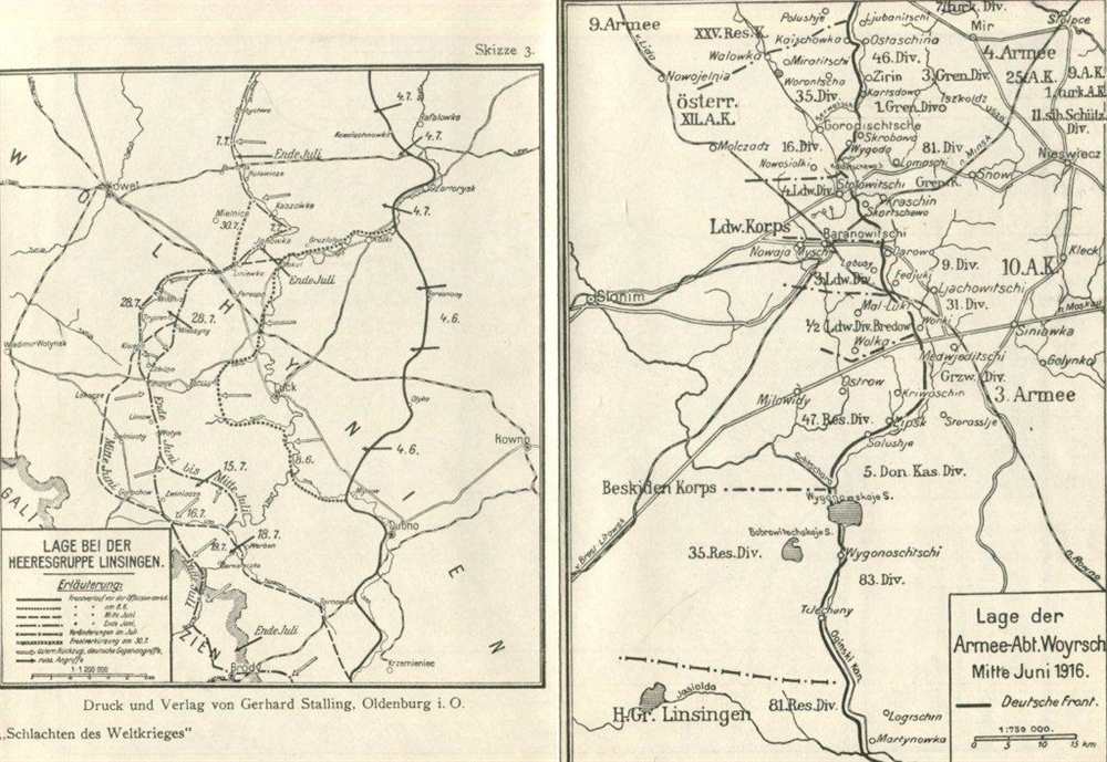 In Einzeldarstellungen bearbeitet und herausgegeben im Auftrage des Reichsarchivs. Die Baranowitschi-Offensive oder auch die Schlacht von Baranowitschi in Weißrussland führte im Juli 1916 zu einer verlustreichen Niederlage der Kaiserlich russischen Armee. Die Kampfräume der Baranowitschi-Offensive und der Brussilow-Offensive wurden durch die Prypjatsümpfe getrennt, die von beiden Seiten mit geringem Truppenaufwand zu halten und für weitreichende und umfassende militärische Aktivitäten ungeeignet waren. Am 5. Juli konnte auch beim Landwehrkorps nach der Wiedergewinnung der verlorenen Darowohöhe die Lage als wiederhergestellt betrachtet werden. Am 7. Juli wies die bei Kraschin-Odochowschschina angegriffene 4. Landwehr-Division die gegnerischen Durchbruchversuche ab. Zwischen 25. und 29. Juli 1916 erneuerten die russischen Truppen ihre Angriffe, welche von der 3. Landwehr-Division abermals abgeschlagen werden konnten. 2. Auflage 1925 Band 9 (Band 2 der 1. Auflage), Gerhard Stalling, Berlin, Halbleinen gebunden mit Goldprägung, 76 Seiten mit s/w Abb. und Skizzen/ Karten, Einband bestoßen und berieben, Innenseiten gut, Schmutztitel mit Stockflecken, Zustand: II-III