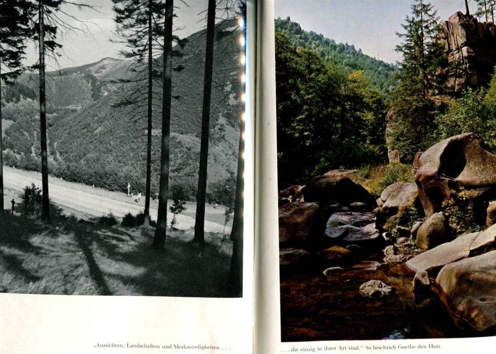 Mit einem Vorwort von Hans Obergethmann. Ein sehr schöner und informativer Bildband über Goslar, Harzlandschaft, Bad Harzburg, Okertal, Harzwald, Altenau, Clausthal-Zellerfeld, Bad Gandersheim, Bergstadt Lautenthal, Bad Grund, Hahnenlee, Wiesenhochtal, Bode, Braunlage, Andreasberg, Achtermann, Polstertal, Wildemann, Herzberg, Luttertal, Bad Lauterbach, Wiesenbek, Siebertal, Odertalsperre, Sösetalsperre, Osterode, Bad Sachsa, Kloster Walkenried, Zorge, Wernigerode, Roßtrappe, Exentanzplatz, Bodetal, Quedlinburg und Halberstadt. ohne Jahresangabe, Verlag Ludwig Simon, München, Bildband im Atlas-Großformat, Halbleinen gebunden, 79 Seiten mit zahlr. s/w und farbigen Bilder und Fotos, Seite 8 und 9 Übersichtskarte vom Harz, Zustand: I-II