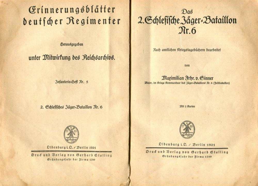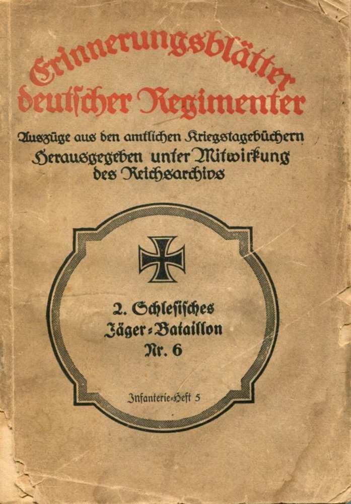 Erinnerungsblätter deutscher Regimenter Herausgegeben unter Mitwirkung des Reichsarchivs. Nach amtl. Kriegstagebüchern bearbeitet mit 2 Karten. Chronologische Auszüge aus den amtlichen Kriegstagebüchern. Truppenteile des ehemaligen preußischen Kontingents. Nach Ende des Ersten Weltkriegs und Rückkehr des Bataillons aus Frankreich in die Garnison Oels am 6. Januar 1919 wurde das Bataillon bis zum 31. Dezember 1920 im Grenzschutz in Schlesien eingesetzt und am 31. Dezember 1920 aufgelöst. 1921, Stalling Verlag, Oldenburg/ Berlin, Broschur gebunden, 143 Seiten, Seiten altersbedingt vergilbt aber gut, Einband fleckig, bestoßen und letzte Seite gelöst, Karten gut, Vorsatz mit Besitzerkürzel, Zustand: II-V