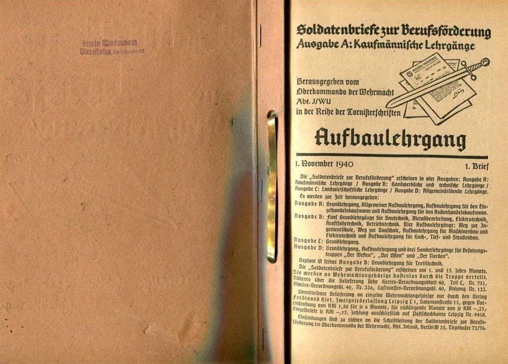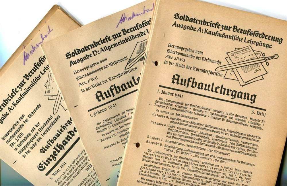 Hier sind Allgemeine-, Aufbau-,Grund- und Kaufmännische Lehrgänge in einzelnen Briefe zu finden. Ausgaben A und D. Aufstellung der Briefe: Ausgabe A 1940: Brief 1, 1 x gelocht 1 x nicht gelocht; Brief 2, 1 x gelocht; Brief 3, 2 x gelocht,1 x nicht gelocht; Brief 4, 1 x gelocht, 1 x nicht gelocht; Ausgabe D 1940: Brief 8, 1 x gelocht. Ausgabe A 1941: Brief 5, 1 x gelocht; Brief 6, 1 x gelocht; Brief 7, 1 x gelocht; Brief 8, 1 x gelocht; Brief 11, 1 x nicht gelocht mit Namen; Brief 13./14., 1 x nicht gelocht; Ausgabe D 1941: Brief 9, 1 x nicht gelocht mit Namen; Brief 11, 1 x nicht gelocht mit Namen; Brief 12, 1 x nicht gelocht mit Namen. Gesamt: 18 Briefe Broschur geheftet, jeder Brief ca. 15 Seiten, 1 x Einband/Hefter aus Pappe. Hrsg. OKW der Wehrmacht, Abt. J/WU in der Reihe der Tornisterschriften, Verlag von Ferdinand Hirt, Leipzig/Breslau, alle Seiten altersbedingt vergilbt und bestoßen, gut lesbar, Zustand: II-IV