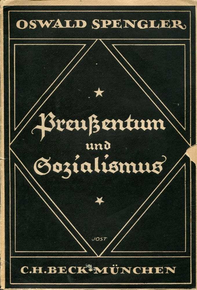 Spengler stellt in Preußentum und Sozialismus zwei fundamental unterschiedliche Lebensanschauungen einander gegenüber: den englischen Liberalismus und den preußischen Sozialismus. Während der englische Liberalismus durch entschiedenen Individualismus und rücksichtslose Gewinnsucht geprägt sei, betone der preußische Sozialismus Zusammengehörigkeit, Solidarität und Volksgemeinschaft. 58.-66. Tausend 1922, C. H. Beck`sche Verlagsbuchhandlung, München, Broschur, 99 Seiten, Titelblatt mit Besitzername, altersbedingte Gebrauchsspuren, mit Bleistift Anstreichungen, Zustand: II-IV