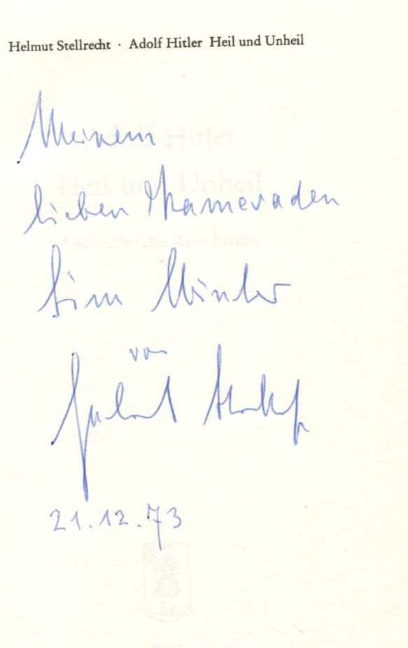 Helmut Stellrecht war ein deutscher nationalsozialistischer Politiker und Propagandist. Als populärwissenschaftlicher und Roman-Autor benutzte er das Pseudonym Hermann Noelle. Der tatsächliche Name erscheint auch in der Schreibweise Hellmuth Stellrecht. Im Klappentext wirbt der Verlag damit, dass hier ein Hitler Nahestehender mit historischer Kenntnis Aspekte darstellt, die es ermöglichen, Hitler aus dem historischen Kontext heraus zu verstehen. 1974, Grabert Verlg, Tübingen, Kunstleder mit Goldprägung und SU (SU bestoßen), Festeinband gebunden, 333 Seiten mit zahlr. s/w Fotos, Bleistift Anstreichungen, Innenseiten sehr gut, Schmutztitel mit Widmung, Zustand: I-II