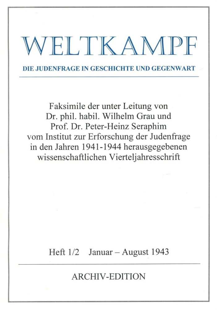 Faksimile der unter Leitung von Dr. Phil. habil. Wilhelm Grau und Prof. Dr. Peter-Heinz Seraphim vom Institut zur Erforschung der Judenfrage in den Jahren 1941- 1944 herausgegebenen wissenschaftlichen Vierteljahresschrift. Inhalt: Aufsätze, Der deutsche Judenvertreibungsplan von 1516, Geschichte Palästinas, Kleine Beiträge, Berichte, Buchbesprechungen, politisches Tagebuch vom 01.09.1942 bis 31.03.1943, Neue Bücher und Aufsätze. Faksimile-Ausgabe 1998, Verlag für ganzheitliche Forschung, Viöl /Nordfriesland, Atlas Großformat, Broschur gebunden, 120 Seiten mit zahlr. s/w Abb., Zustand: I-II