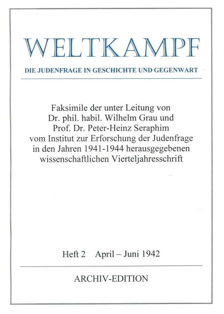 Faksimile der unter Leitung von Dr. Phil. habil. Wilhelm Grau und Prof. Dr. Peter-Heinz Seraphim vom Institut zur Erforschung der Judenfrage in den Jahren 1941- 1944 herausgegebenen wissenschaftlichen Vierteljahresschrift. Inhalt: Aufsätze, Rassenforschung und Antisemitismus, Emanzipation, französische Juden, Judenfrage im Theater, Siegel und Wappen der Juden in Frankreich, Kleine Beiträge, Berichte, Buchbesprechungen, politisches Tagebuch vom 01.01. bis 28.02.1942, Neue Bücher und Aufsätze. Faksimile-Ausgabe 1998, Verlag für ganzheitliche Forschung, Viöl /Nordfriesland, Atlas Großformat, Broschur gebunden, 89 bis 186 Seiten, Zustand: I-II